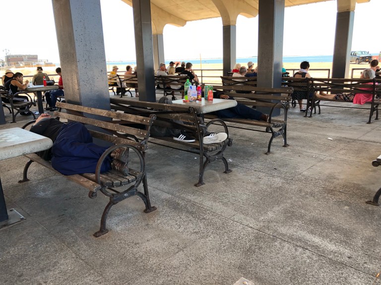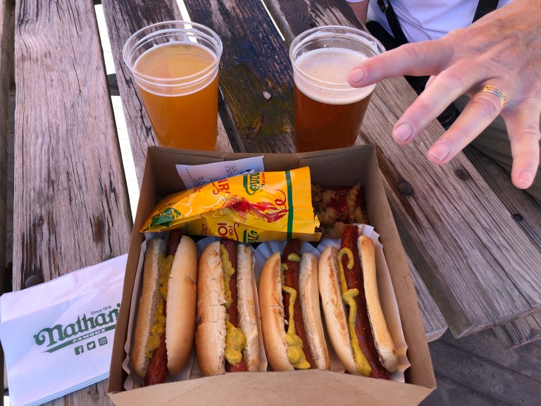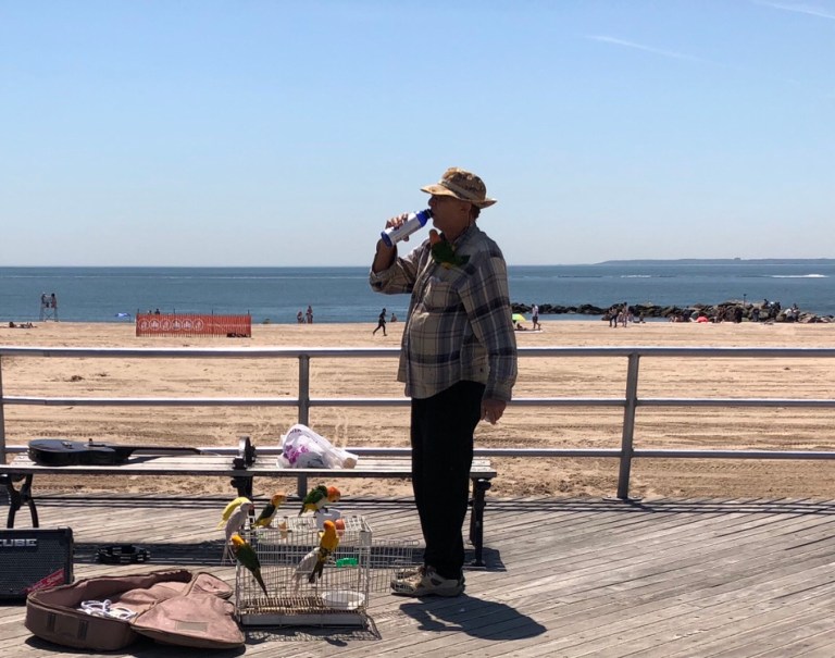 And don’t forget Nathan’s hot dogs, fries and beer. Steve is reaching for some fries!Thought we might go to the aquarium and then sawAll the school buses and children arriving and decided against it. It was just nice to enjoy the beautiful day. I think this man is from Florida. He takes his birds and summer’s on the boardwalk at Coney Island with his birds!
