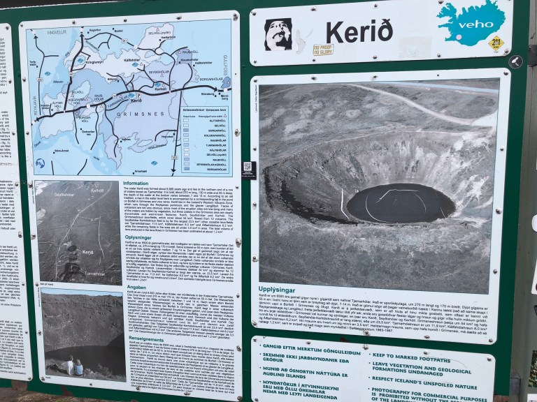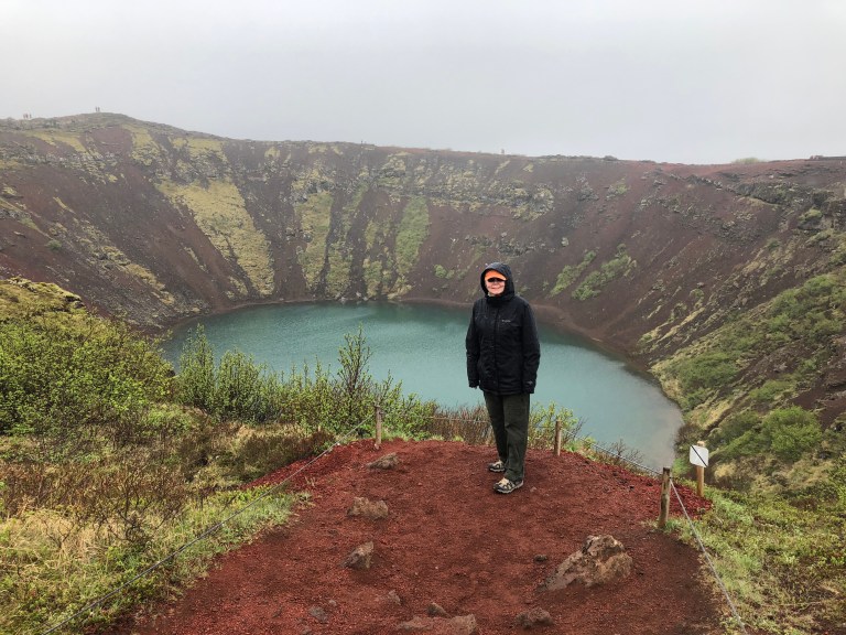 The country side is rolling hills, greener landscape with more trees and more cars on the road touring. Our first stop off of route 35 is to see a larger volcanic crater, Kerid. There is a trail around the top edge and steps down to the edge of the lake in the crater. It is starting to rain hard but we are hardy souls, so we walk the trail taking too many pictures, of course.