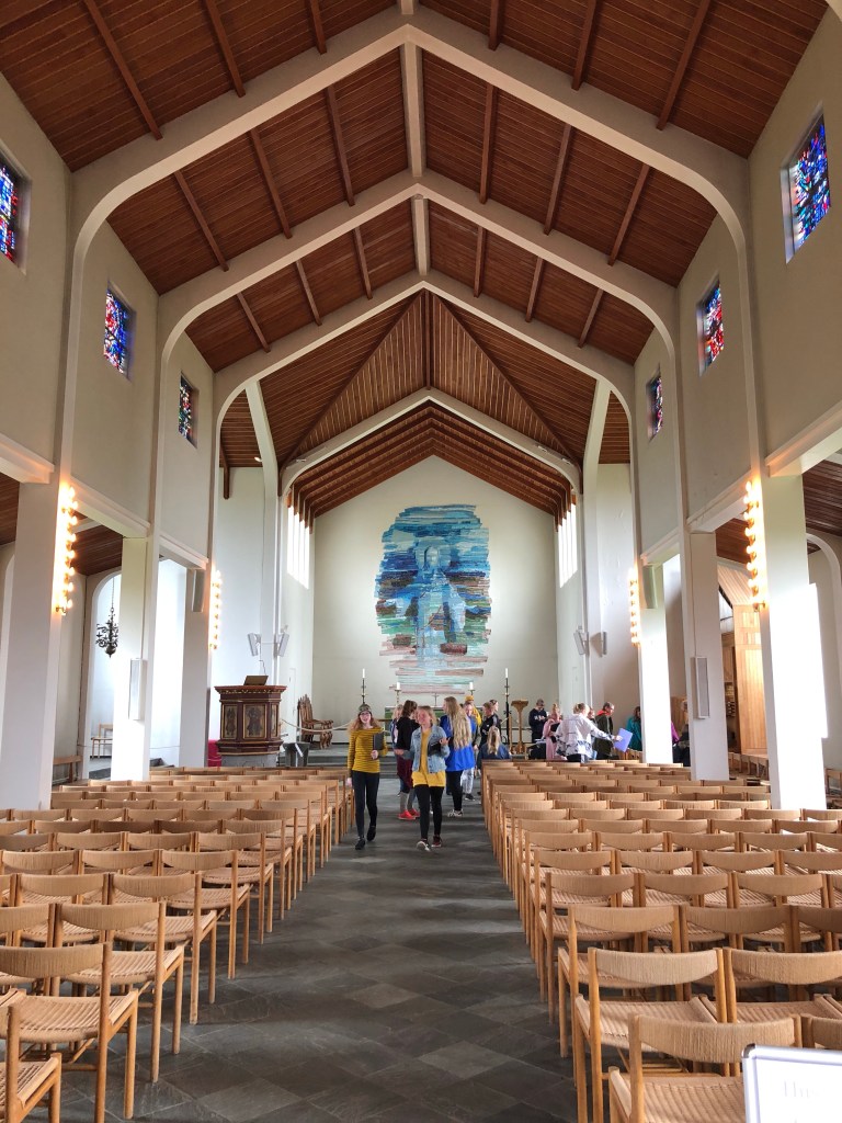 The surrounding countryside vistas are beautiful, even in the rain. You can see why this spot was chosen as a settlement and continues to be a place of interest. A small youth choir is singing in the church when we arrive. Rich and Stacy talk to the choir director and learn the youth are from different parts the country of Iceland and are attending a music camp for honors students. They will be performing in the church on Sunday.