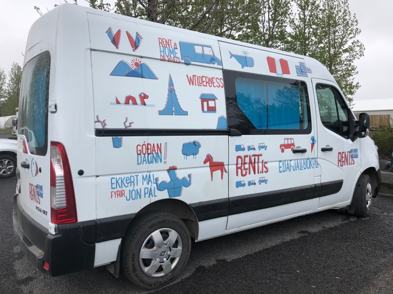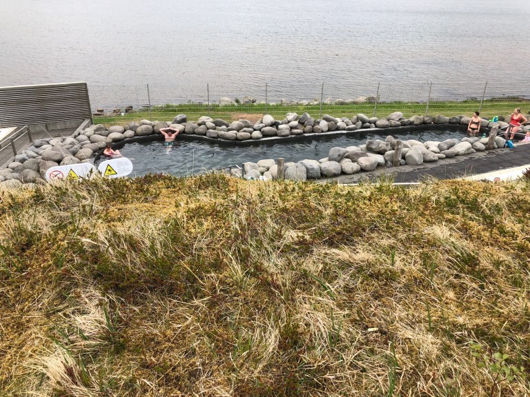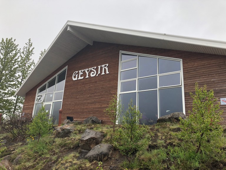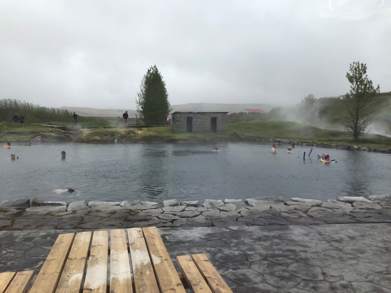 We make a stop in Fludir. Here is Gamla Laugin (Secret Lagoon). Built in 1891, the Secret Lagoon is considered the oldest geothermal swimming pool of Iceland. No one took a dip; it is just too raining and cold right now for our thin skin. This location is also a favorite of people from Reykjavik on the weekends we are told. In the parking lot, we notice one of many small mini-van-type vehicles for renting to camp.