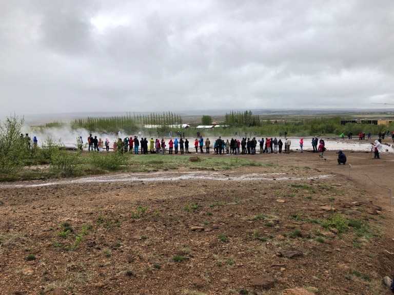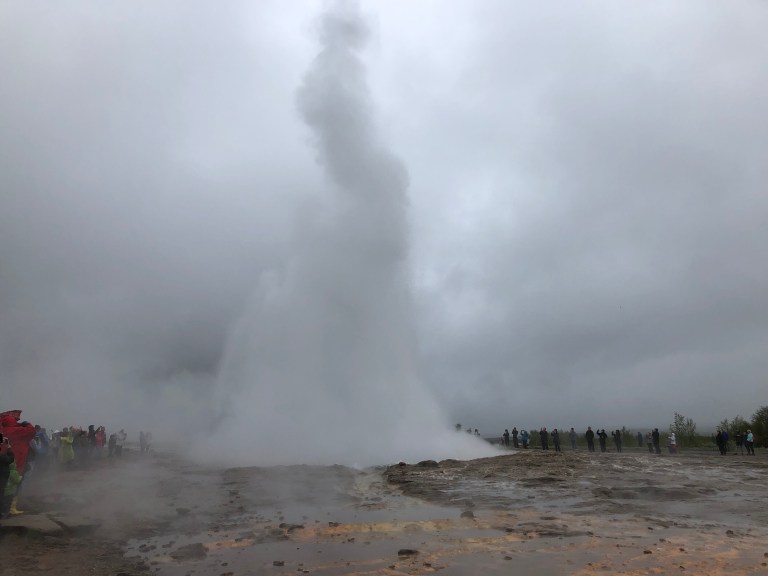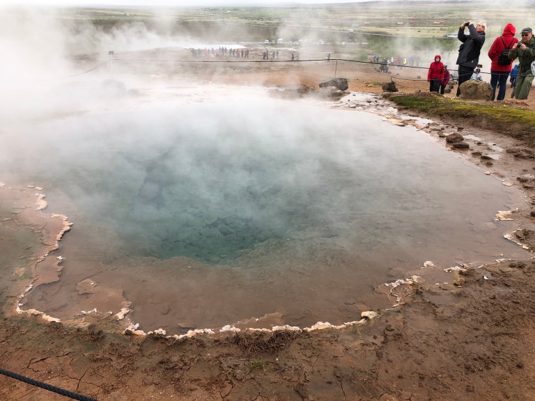 On the Golden Circle, there are several major geological sites. The town of Geysir is appropriately named. Several geysers in a geothermal field are here spitting up every several minutes or so. Seems like everyone stops here to see the Strokkur. Strokkur’s height varies as it erupts erratically. You have to be quick with your camera to catch it’s eruption. So different from Yellowstone’s Old Faithful that erupts like clockwater and always seems to be the same height.