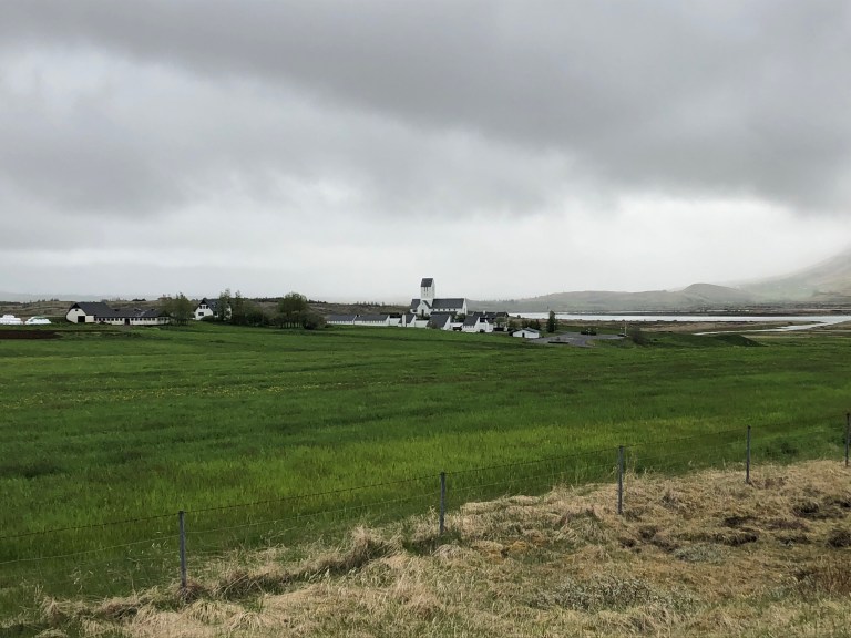 The surrounding countryside vistas are beautiful, even in the rain. You can see why this spot was chosen as a settlement and continues to be a place of interest. A small youth choir is singing in the church when we arrive. Rich and Stacy talk to the choir director and learn the youth are from different parts the country of Iceland and are attending a music camp for honors students. They will be performing in the church on Sunday.
