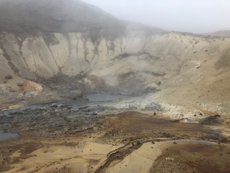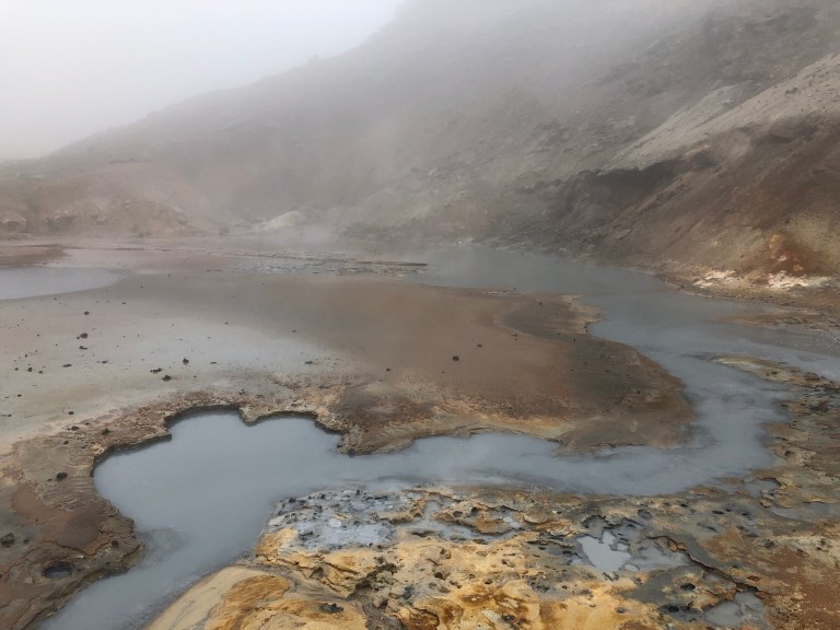 Then drive up route 42, through a lava encrusted landscape and the Nature Preserve to see more geothermal activity (mud pots) at Seltun and the beautiful Lake Kleifavatn. Of course, I am certain that if it wasn’t pea soup fog and raining the experience would be delightful.