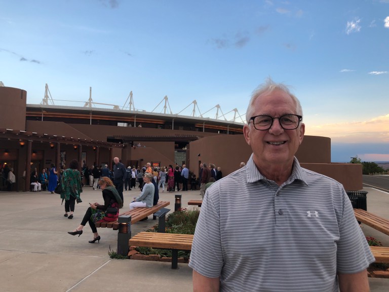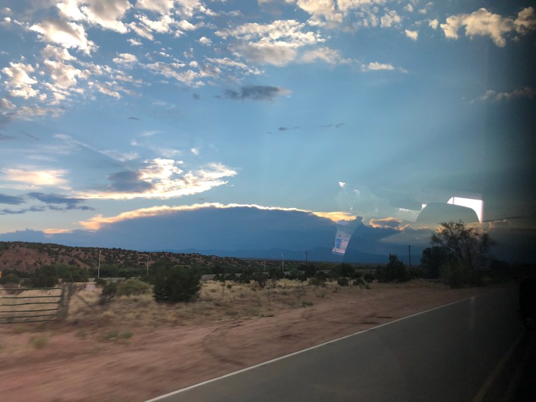 Our first visit to Santa Fe Opera. The hotel shuttle drops us off right in front as the sun was setting behind a huge dark cloud.