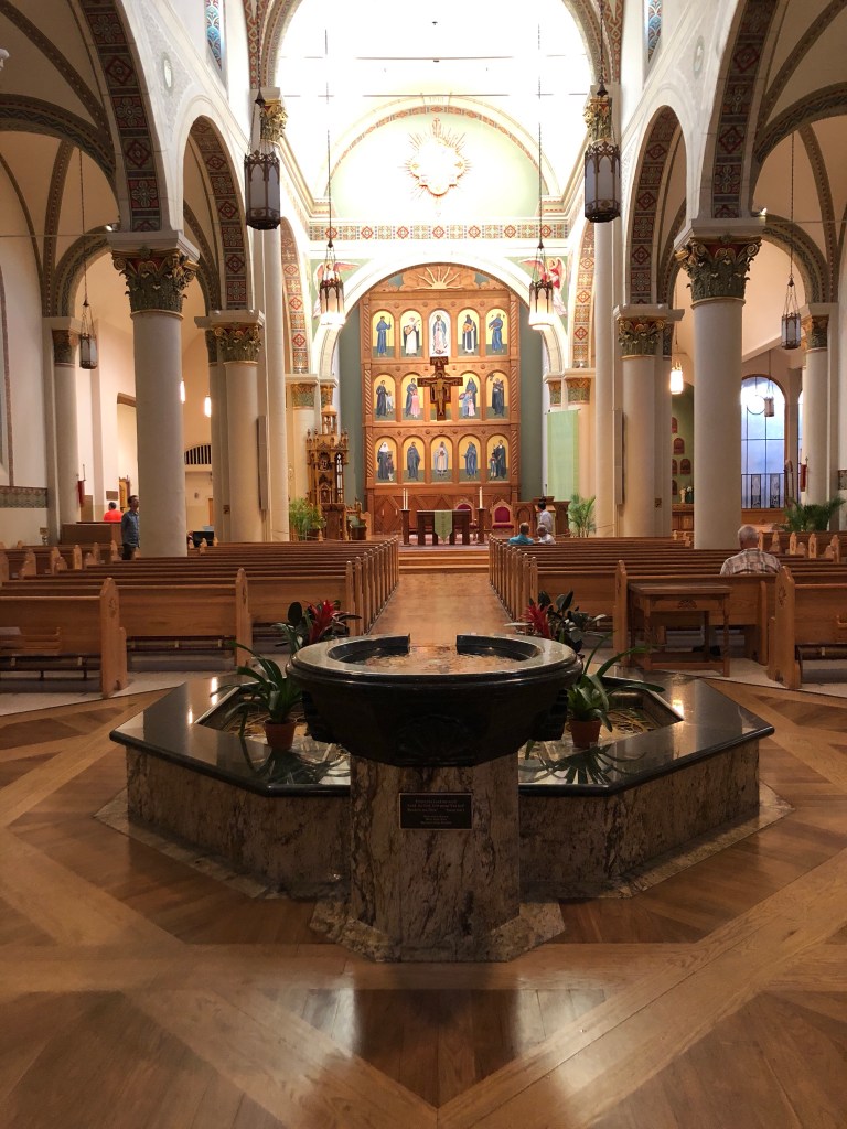 Cathedral Basilica of St. Francis of Assisi with a new statue near the entry of the “First Indian of North America to be promoted to a Saint” – Kateri Tekakwitha 1656-1680.