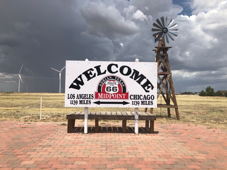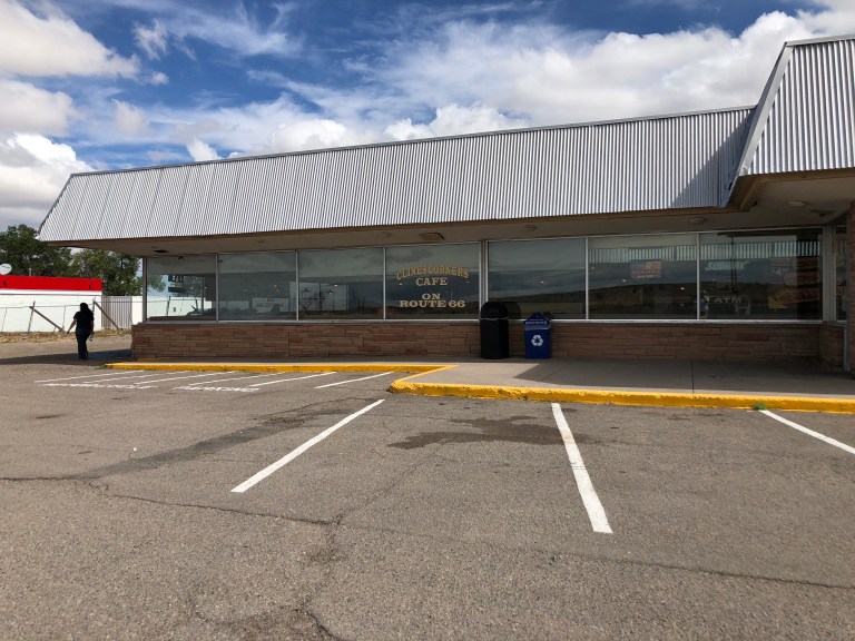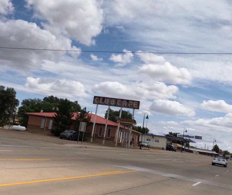 Vega, Texas is the midway on Route 66 and we are happy to find the diner is still there with the wind farm across the way.