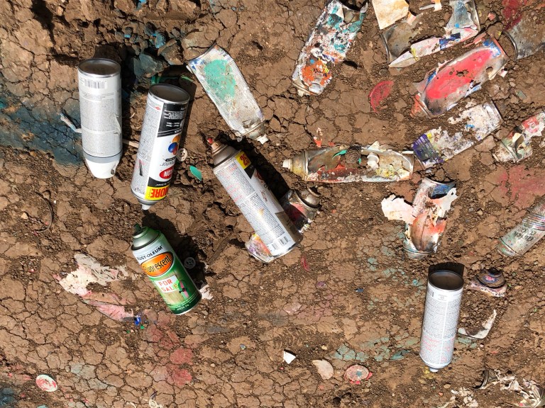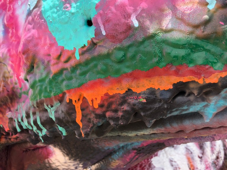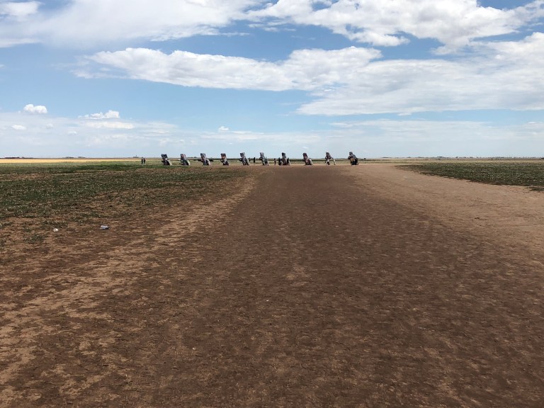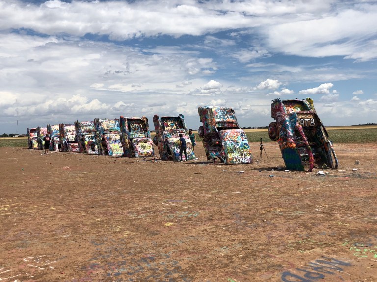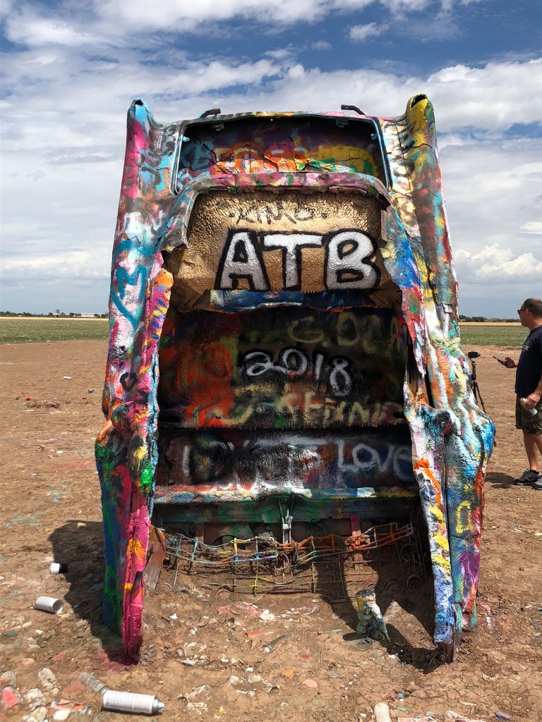 Cadillac Ranch – 10 old Cadillacs sticking out of the ground just west of Amarillo are surviving. What is disappointing to us is how man spray paint cans are laying on the ground as trash. This was never done in the past. Sad people think it is okay 😳😡