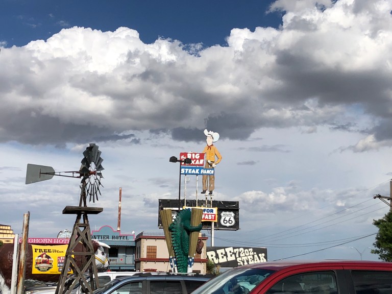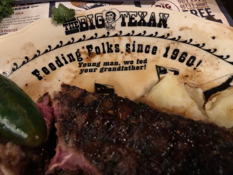 We arrived at our Amarillo Hotel and did laundry for the first time on this trip. Dinner is at the Big Texan Steakhouse – a tradition if you ever come thru Amarillo. Funny we found out from the front desk at our hotel that they now have a limo that will pick you up and take you to the restaurant.