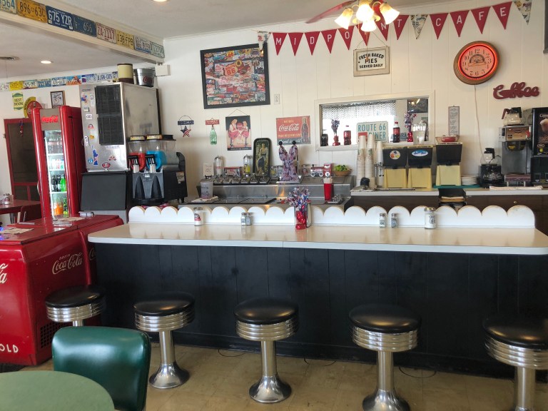Vega, Texas is the midway on Route 66 and we are happy to find the diner is still there with the wind farm across the way.