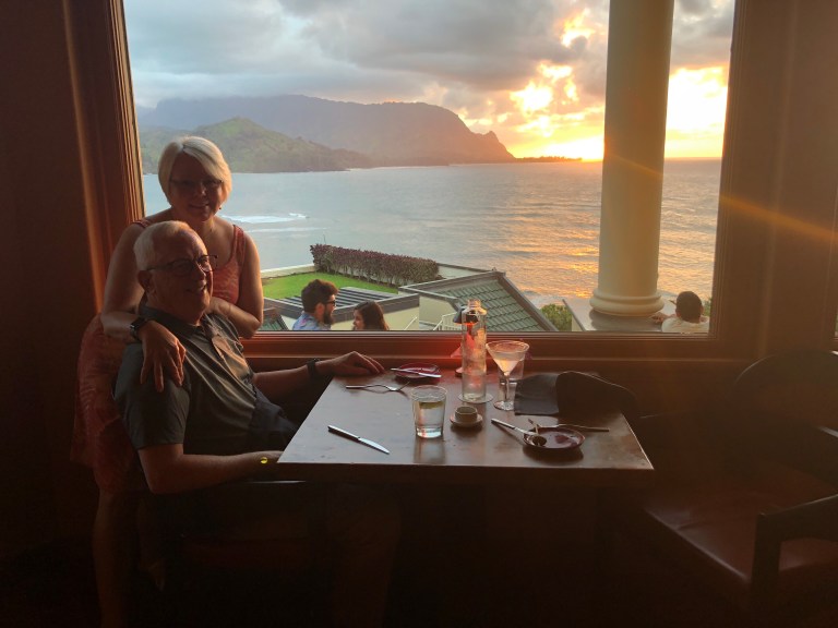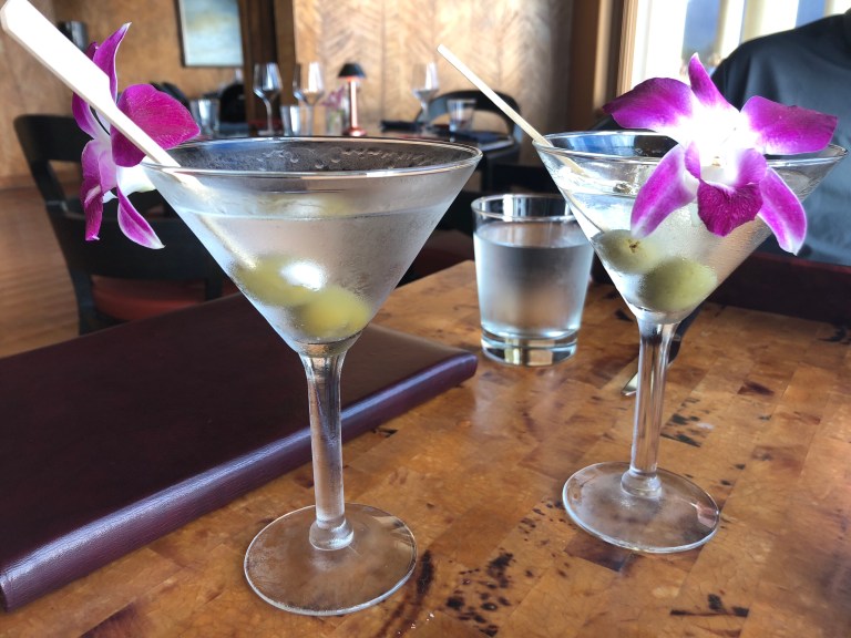 Then back in the villa, we finish watching “South Pacific” to see what places we might have missed. Dinner is at Kauai Grill in the St. Regis Hotel only a mile from where we are staying. A beautiful view, air conditioning, great martinis, delicious food and nice treats from the chef ‘s amuse bouche, glass of champagne, flowers with our drinks and an offer to take a pix by our server.