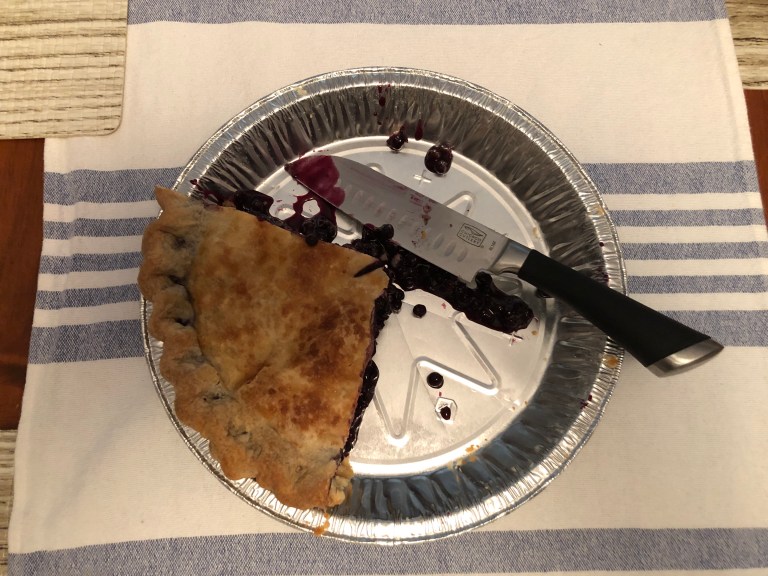 Dinner at home tonight. Since we couldn’t find any blueberry pies in town (all sold out and one place wasn’t open), Kathleen is making us a blueberry pie to enjoy. Yum!