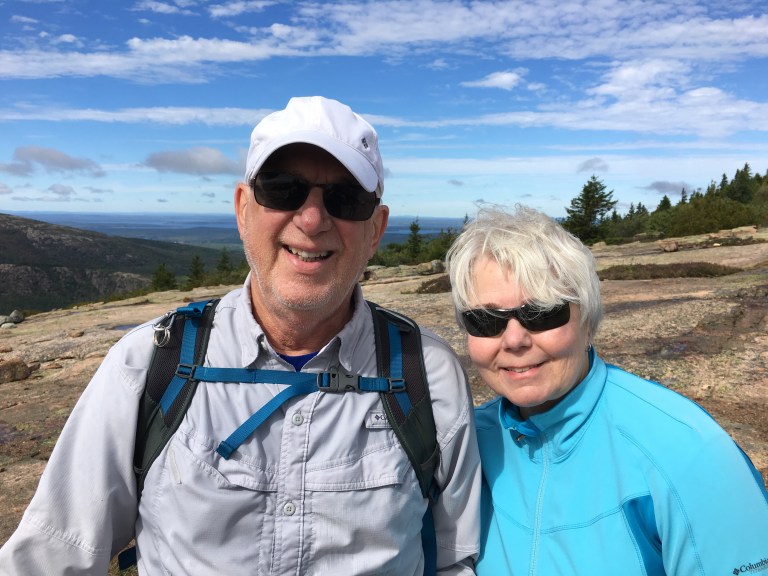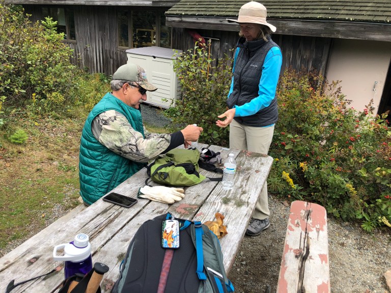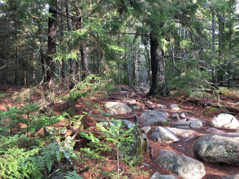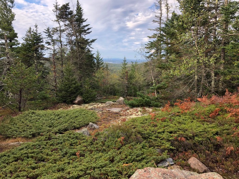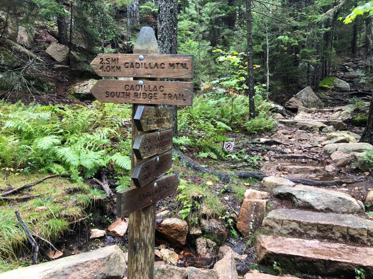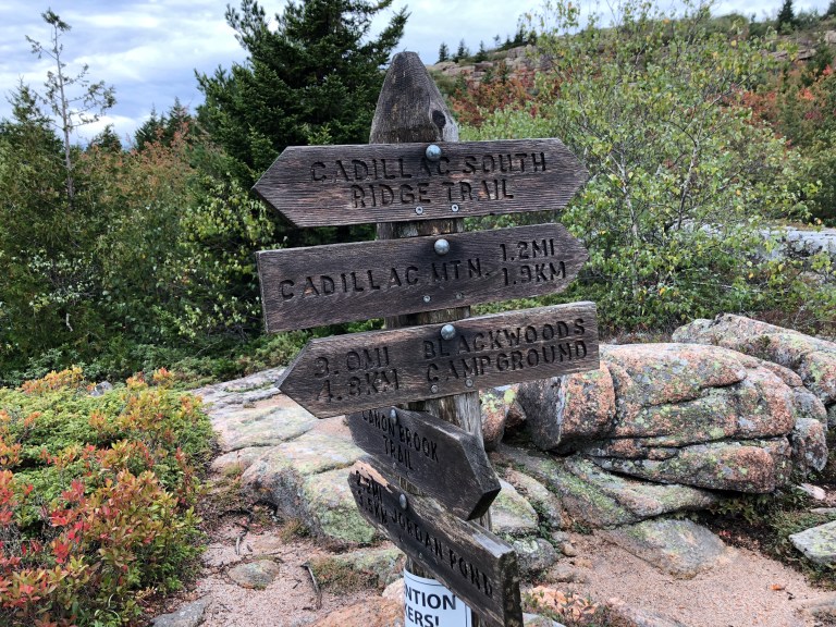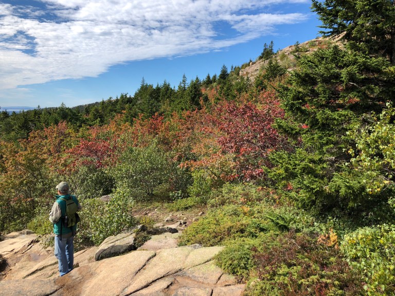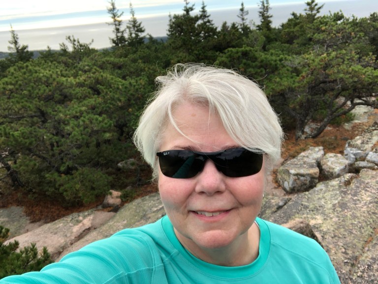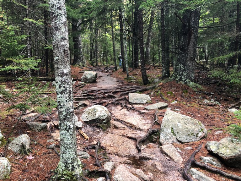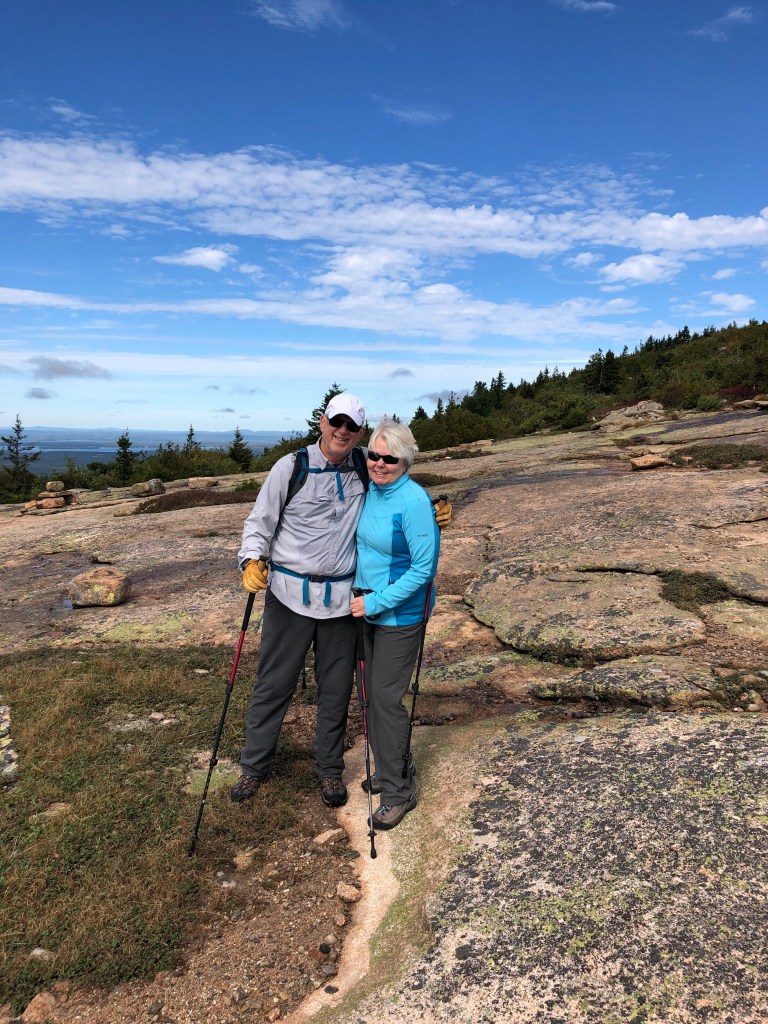 On Thursday morning, we head to Cadillac Mountain’s South Ridge Trail to challenge ourselves. This is a hike that Steve and I have done every time we’ve come here. It’s a 7 mile hike up and back from Route 3. The weather has cooperated with a bit of a cloud cover. We start the hike at 7:50 a.m. and arrive on top of Cadillac Mountain at 10:20 a.m. 3.6 miles with an elevation gain of 1,420 feet. We take a 30 minute break to load up on energy and fill our water bottles. Back down 10:50 a.m. until 1:15 pm. A few challenging rock climbs up and down, roots, mountain rock, paths through pine trees and small pools of water to avoid along the trail because of the rain last night. This is the best of the best!
