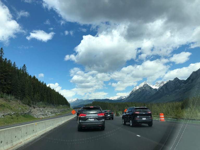 Then we drove further north to the Park and Ride to take the shuttle to Lake Louise. Road construction along the way – delayed but did not deter us!