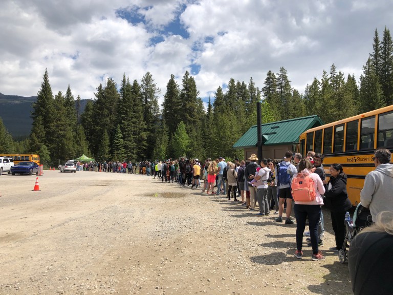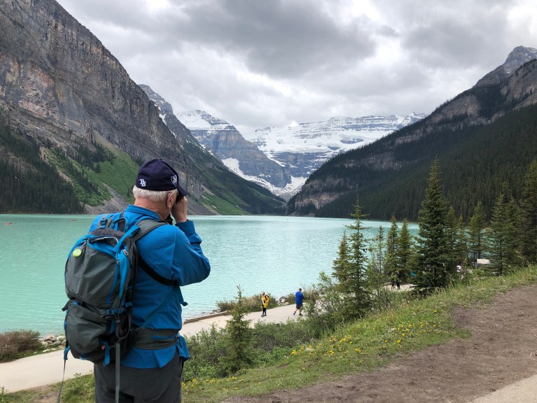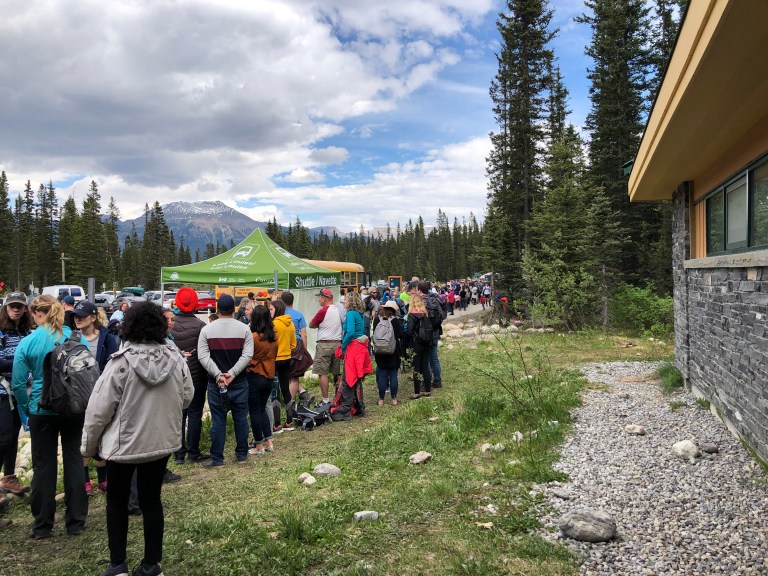 The crowds were more than the park staff could handle. Then, they charged $4.00 per adult for the shuttle and only accepted credit cards. So the line to pay for the shuttle, the credit card process and the number of shuttles available caused us to wait in line for an hour to take a 20 minute shuttle to Lake Louise. Bonus while waiting; we learned about another hike for tomorrow and talk with Disney Vacation Club owners who live in the area.