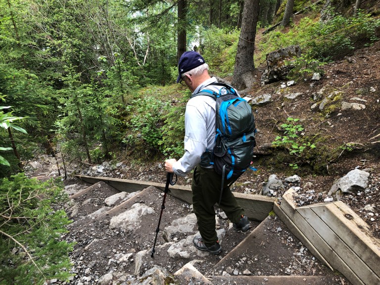 Another beautiful day of weather. The hiking trail takes you up on a gravel road/trail to two beautiful, clear turquoise-tinted lakes. If you hike beyond, there is a water reservoir and even better views we are told. However, the stairs and the subsequent rock-slide area made us reconsider. We did go up a little ways, spotting rock climbers preparing to go up the side of a cliff.