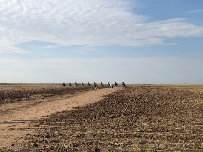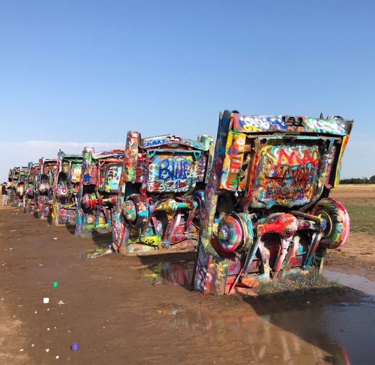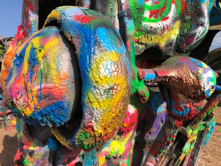 Since then, many people have visited and spray painted their own message on to these Cadillacs. We have never done that but enjoy seeing the progressive deterioration of these old caddy’s sticking up out in a field in the outskirts of Amarillo. Behind the exhibit – nothing but Texas dirt.