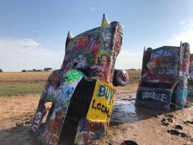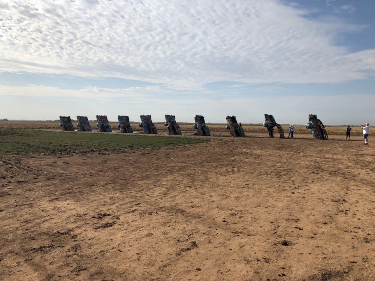 First stop – another tradition when driving down I-40 thru Amarillo – Cadillac Ranch. It has been a tourist attraction since 1974. From Wikipedia: The installation half-buried ten Cadillacs (1949-1963) nose-first in the ground. Installed in 1974, the cars were either older running, used or junk cars — together spanning the successive generations of the car line — and the defining evolution of their tailfins.