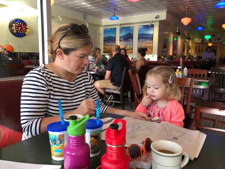Everyone relaxed at their place for the evening. A plan came together to meet for breakfast bright and early Wednesday. As mentioned in an earlier blog, the only ‘real’ place for a Santa Fe downtown breakfast is the Plaza Cafe. The morning is cool and after a short walk we are there. The girls color and Papa finds a new calling (reading coloring book narratives in his deepest voice) while waiting for their food. Delicious!