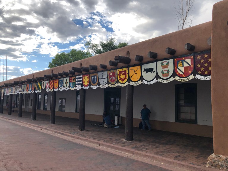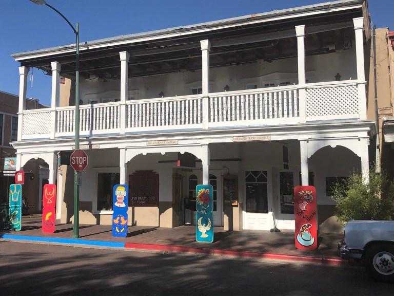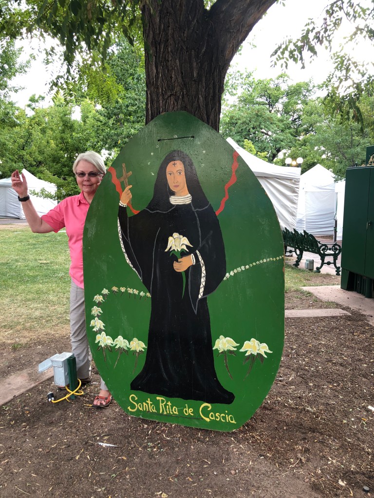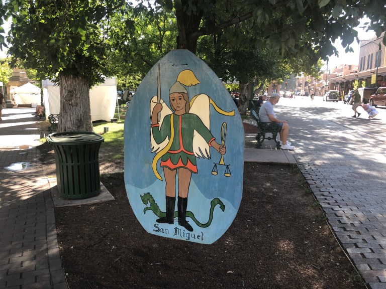 Yesterday was our walk/hike to the Railyard district via the Plaza. The Plaza was alive with people setting up their tents for displaying their art. Around the Plaza are flags and boards creating an artsy, celebratory space. The art fair will be happening all weekend in the Plaza, along with parades and other celebrations including the famous burning of Zozobra. Check out the YouTube video: https://youtu.be/Ht6rTUvn7Jc