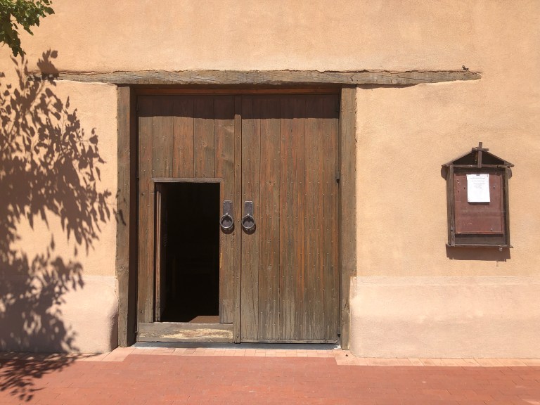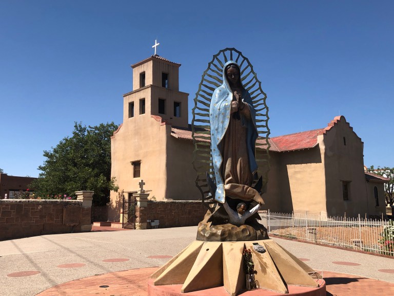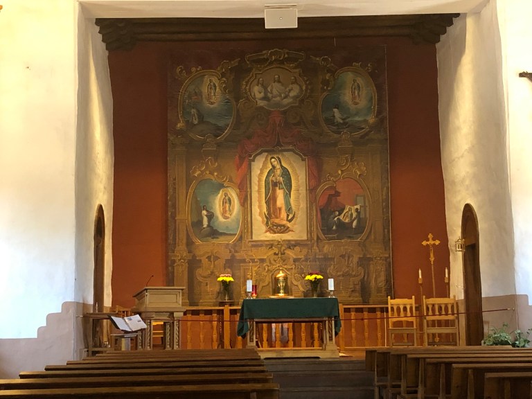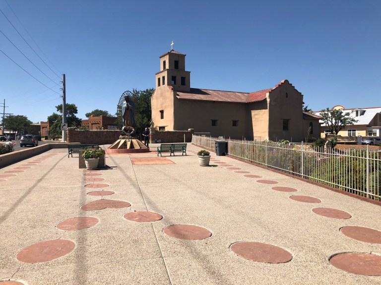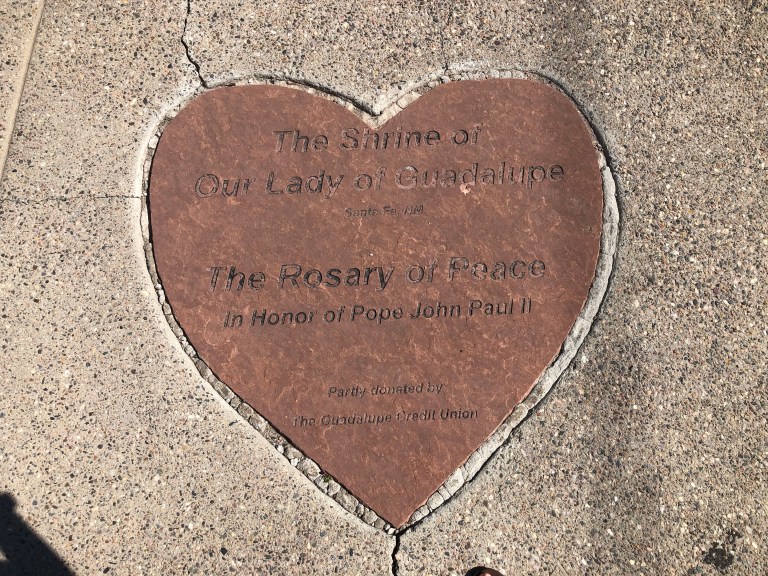 We then stop at the Santuria de Guadalupe – The oldest shrine to Our Lady of Guadalope in the U.S.A., built around 1785. The doorway seems to indicate it is built in an earlier time. Inside it is quaint and less ornate than the St. Francis Cathedral. Outside is the Lady statue and on the ground around her is a rosary made with dedicated stones from the many Catholic Churches in New Mexico.
