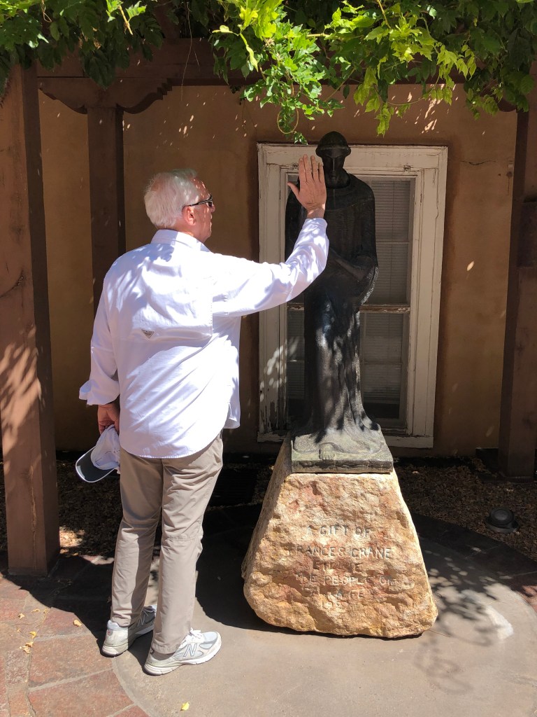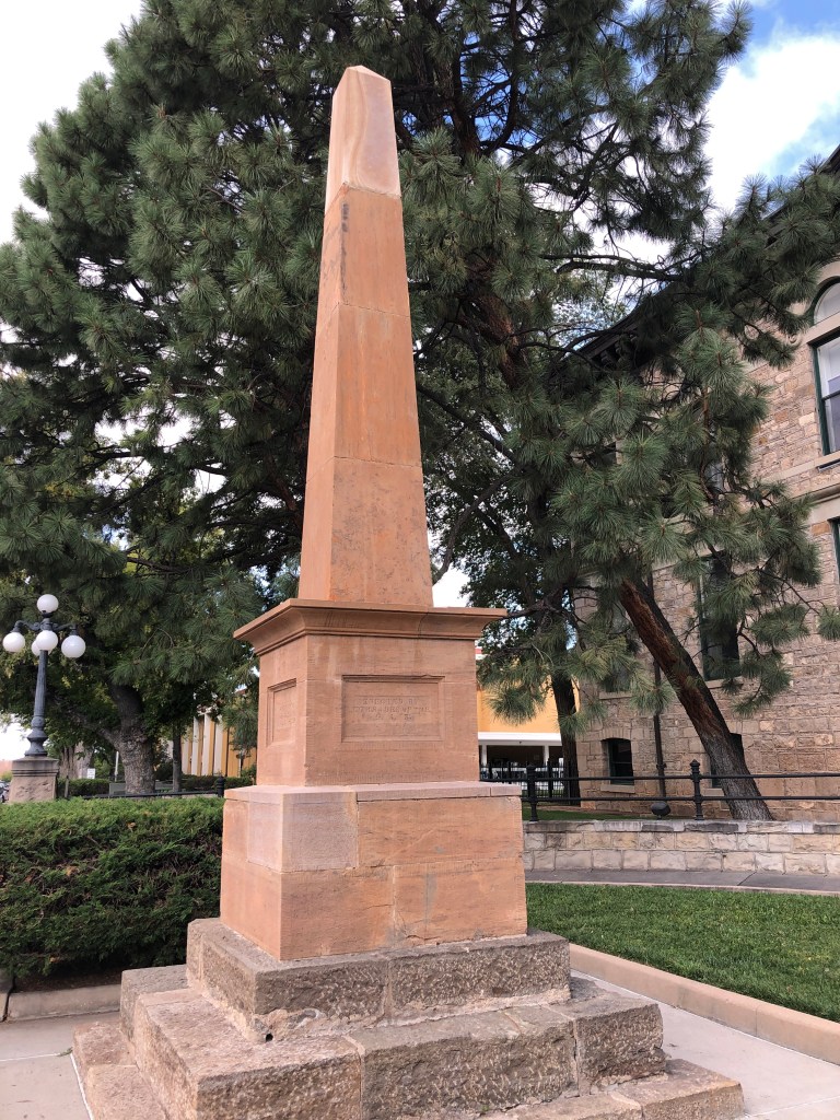 A full moon and a Friday the 13th together speak volumes – “Stay close to home and enjoy downtown Santa Fe.” This morning is the best – cool temps and no crowds. First stop, the post office to mail important stuff to the IRS. Walking past the Court House we see an obelisk erected in memory of Kit Carson.