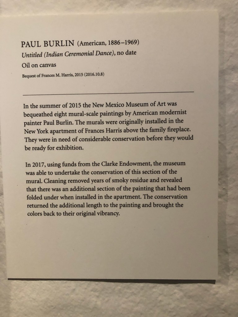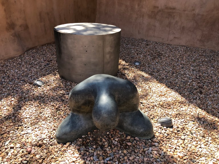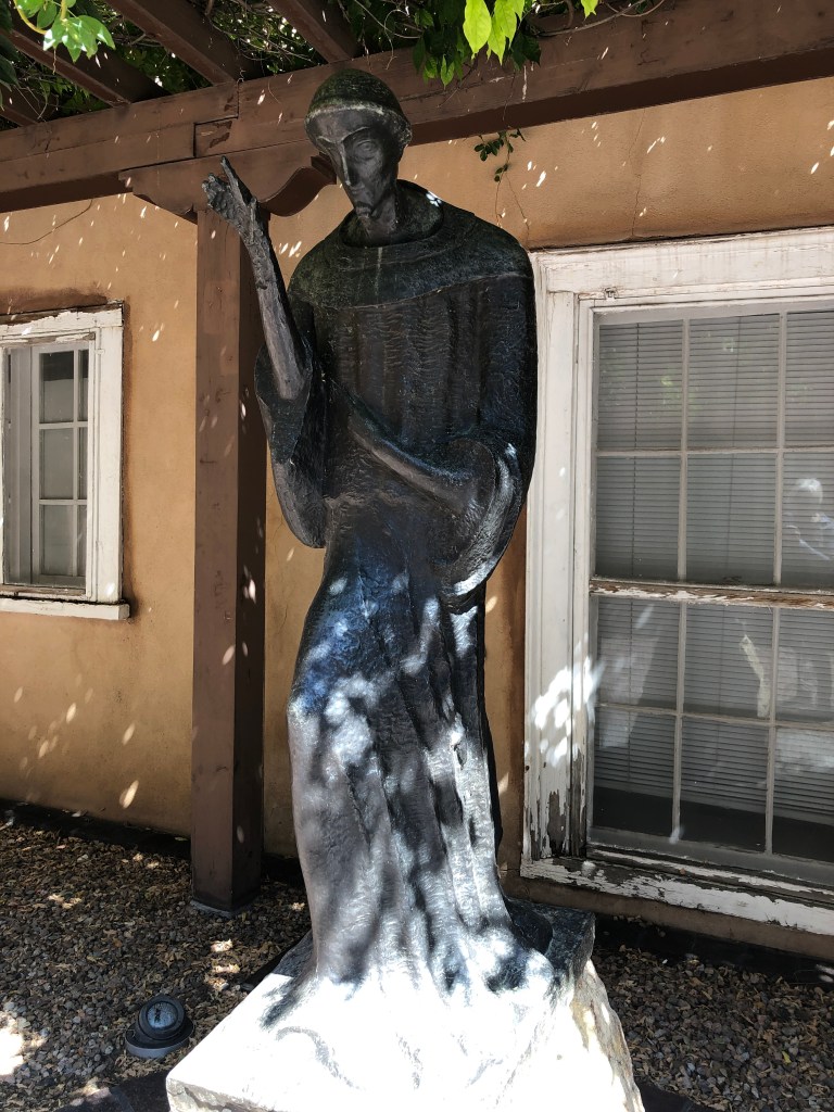 Wrap-up the morning with an hour-plus at the New Mexico Museum of Art on the corner of the Plaza. This Museum was the “first art museum in New Mexico. Much of the furniture is original to the building and specifically designed for the Museum,” the brochure/map says. We agree this is a really fantastic museum – 101 years old – with revolving exhibit rooms and two sculpture gardens. We walked thru most of the museum but missed one sculpture garden and the Saint Francis Auditorium.