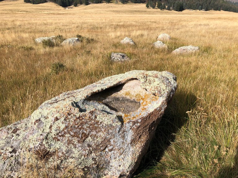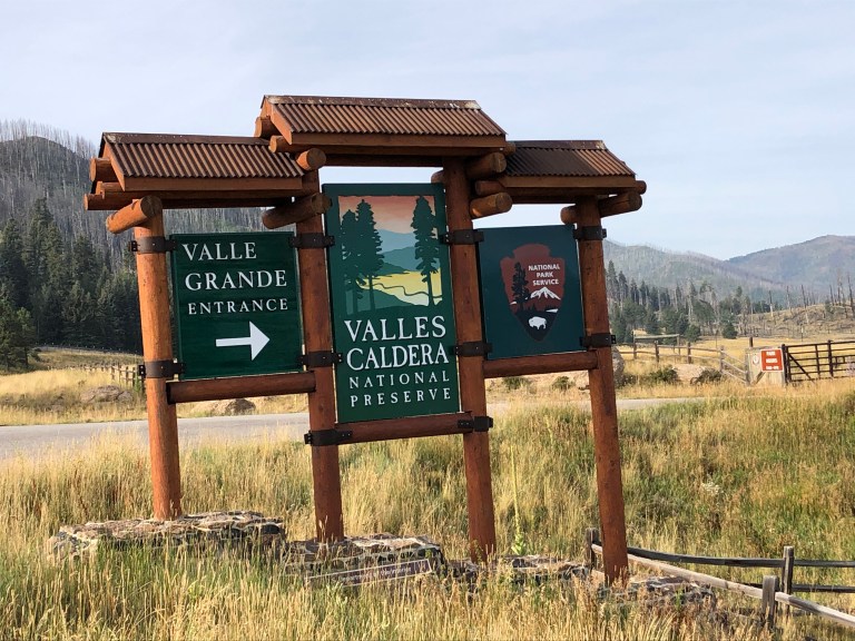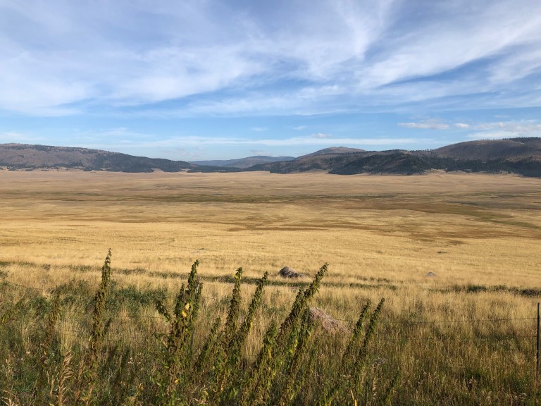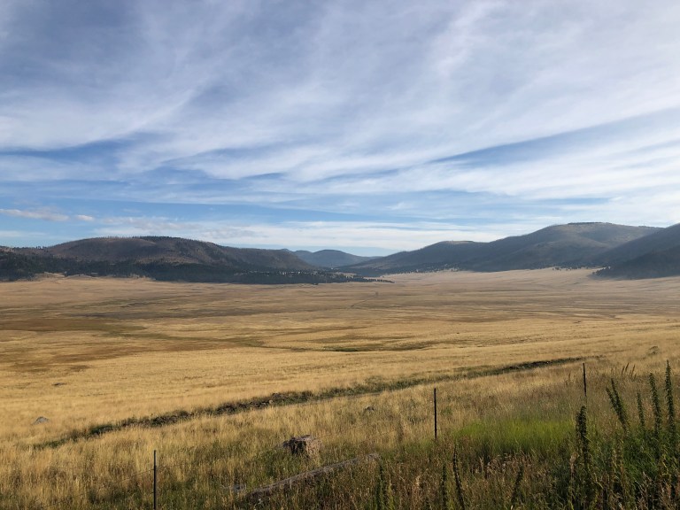 Being early risers, we drive up to the Valles Caldera first. It’s a beautiful cool almost fall like day. The Valles Caldera is at over 8,000 feet in elevation, and you have to drive over the mountains to get there. This is only our second time visiting. When the valley comes in into view, it is absolutely stunning – a huge 13.7 mile wide volcano caldera, thankfully inactive.