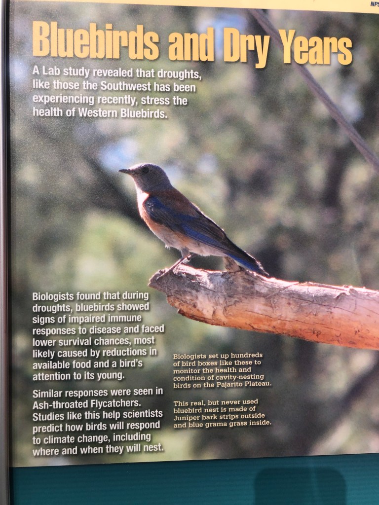 A dirt road takes you the Valles Caldera National Preserve and a small visitor center. Ranger-led talks and hikes are available. There is also a shuttle that will take you out to the old ranch house where Longmire was filmed. We didn’t take that detour last time, nor this time. There is a short hike around a volcanic mass, through the grasslands. Many Mountain Bluebirds watch us and fly ahead along the trail while very obese prairie dogs scamper back and forth to their holes/homes.