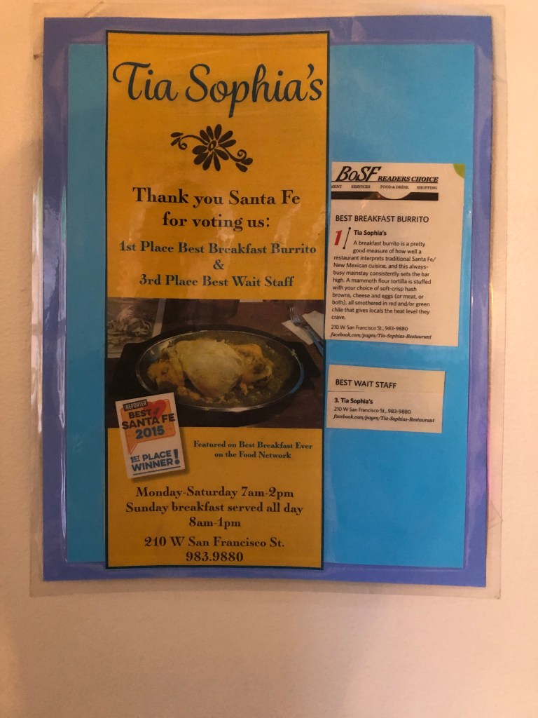 Start with food – every day – something interesting and Santa Fe popular – Tia Sophia’s. Our waiter is a jokester—one liners, corny but funny at 8 AM in the morning. Breakfast Burrito anyone?