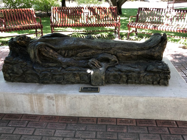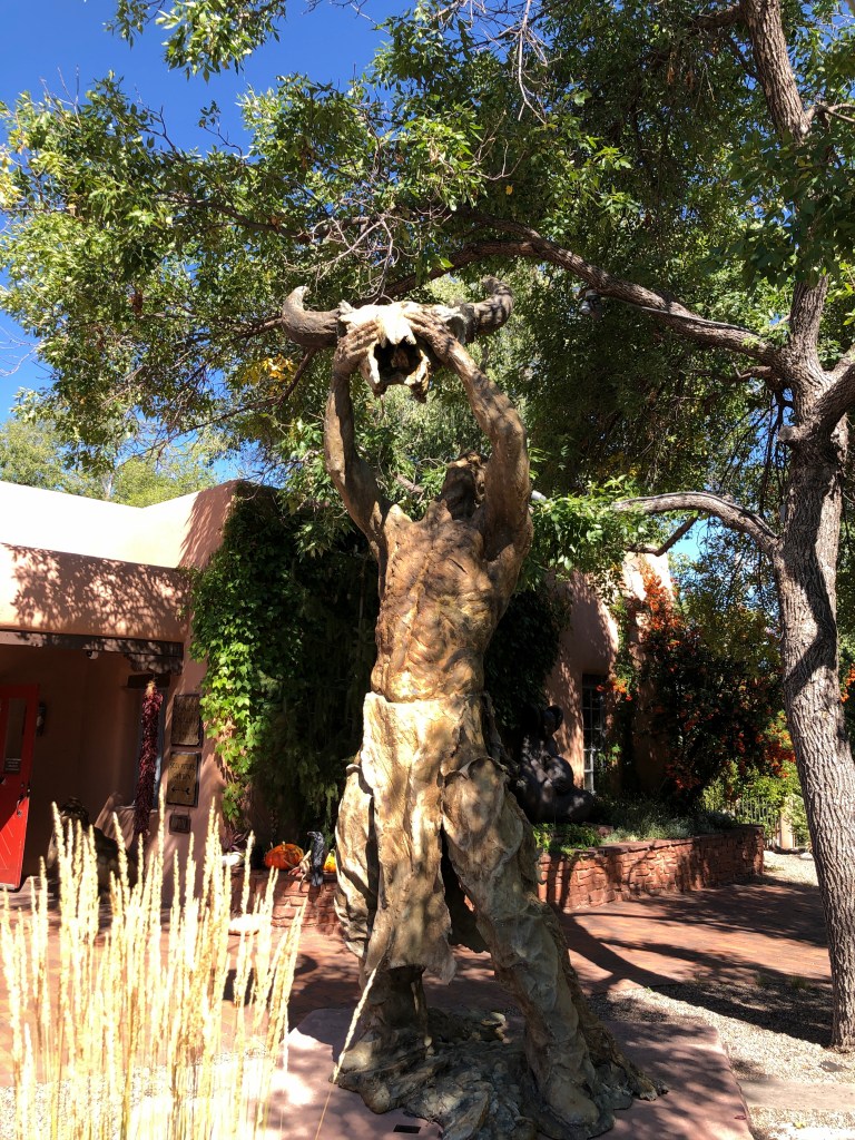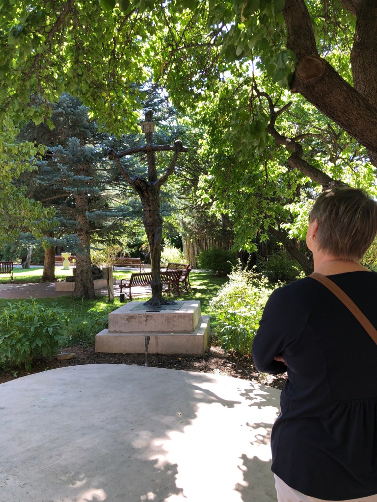 After the Loretto Line Tour we went to the sculpture garden behind the St. Francis Cathedral – didn’t even know it was there until our tour guide told us about it. We find it is the stations of the cross around the garden with a path that is the shape of rosary. Just lovely and emotional. An emaciated and sinewy Christ suffering through the Passion.