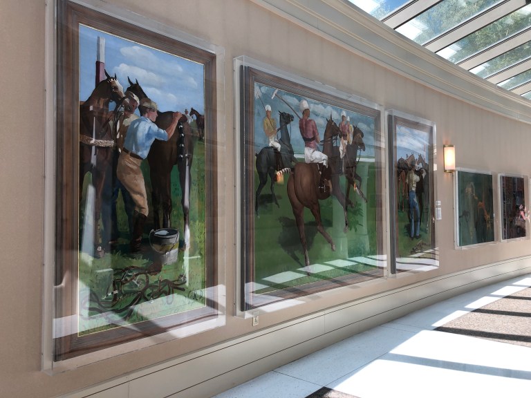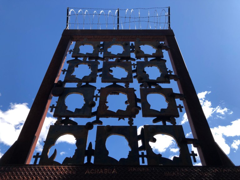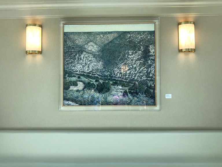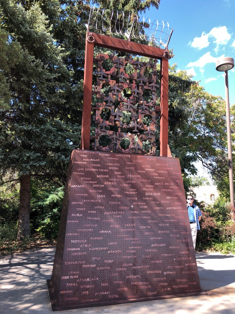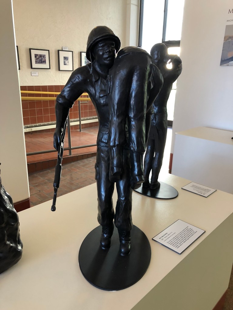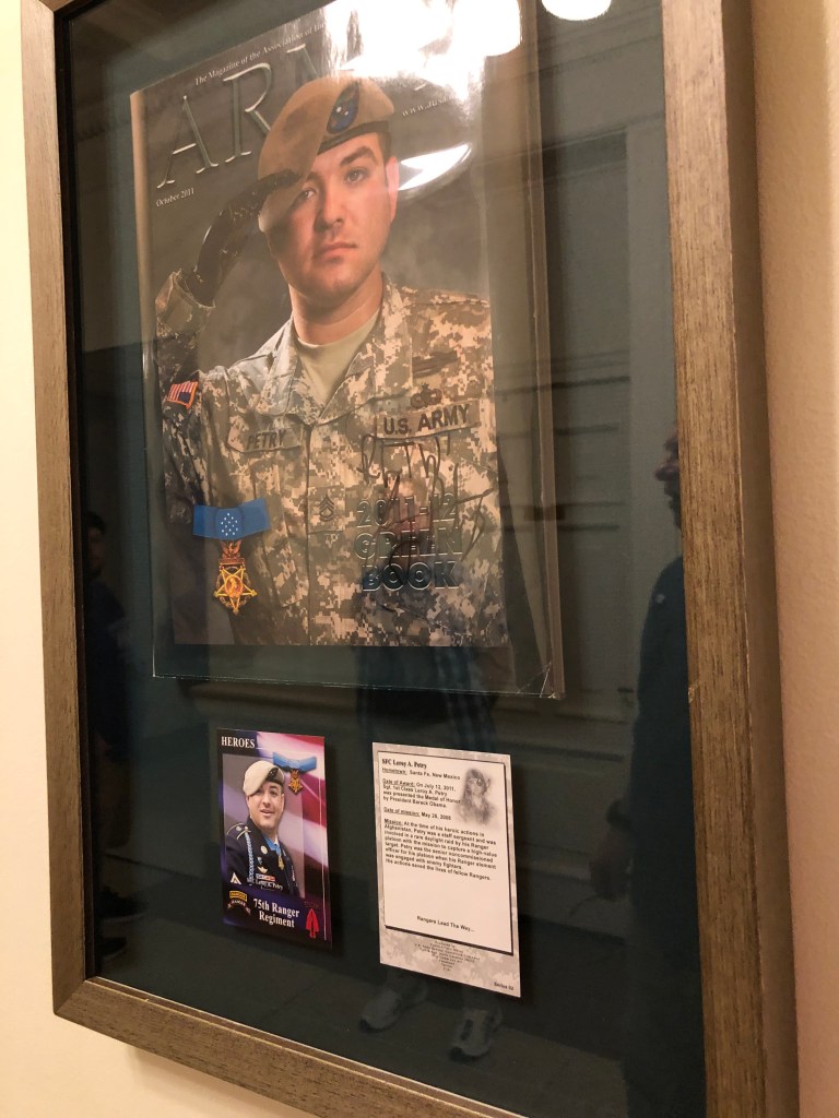 The next building we visit is the Bataan Memorial Building, which also houses all the Veterans Administration services. Our tour guide, Nicholas, tells us he served in the supply group of the 10th Mountain 4th Brigade at Fort Polk, serving the infantry! Hey our son was there. This young man went in to the service in 2009 when our son was getting out. Thank you all for your service! More memorials and artwork by a blind Vietnam veteran –