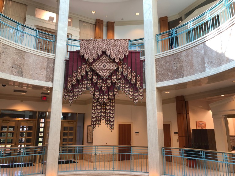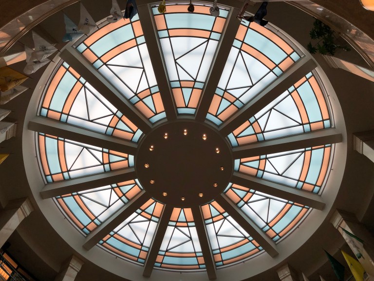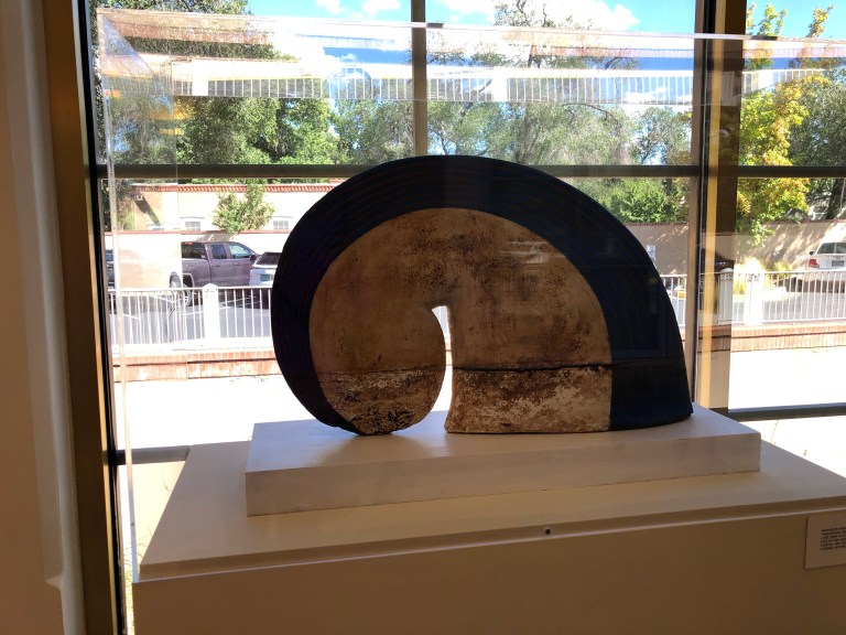 The building is shaped in the Zia symbol of the New Mexican flag. Inside is an incredibly huge and well displayed array of artwork – over 600 pieces. The Rotunda (not a dome) ceiling is a beautiful stained glass window patterned after a Native American basket weave symbolizing the sky and the earth.