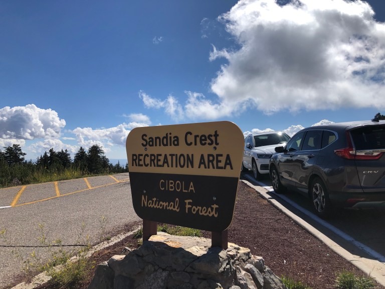 Once we reach Cedar Crest, there is a turn off to the Sandia Peak. A drive up to 10,678 on the road winding its way through the Cibola National Forest will bring you to the top at Sandia Crest. We see trails where you could stop and hike, the Ski Area (not open) and bicyclists making the climb.