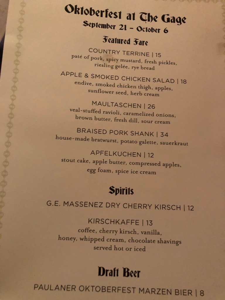 Visit with Mark, travel into the city and see where Mary is attending school. Then dinner at The Gage restaurant on Michigan Ave. Of course they are serving up an Oktoberfest menu.