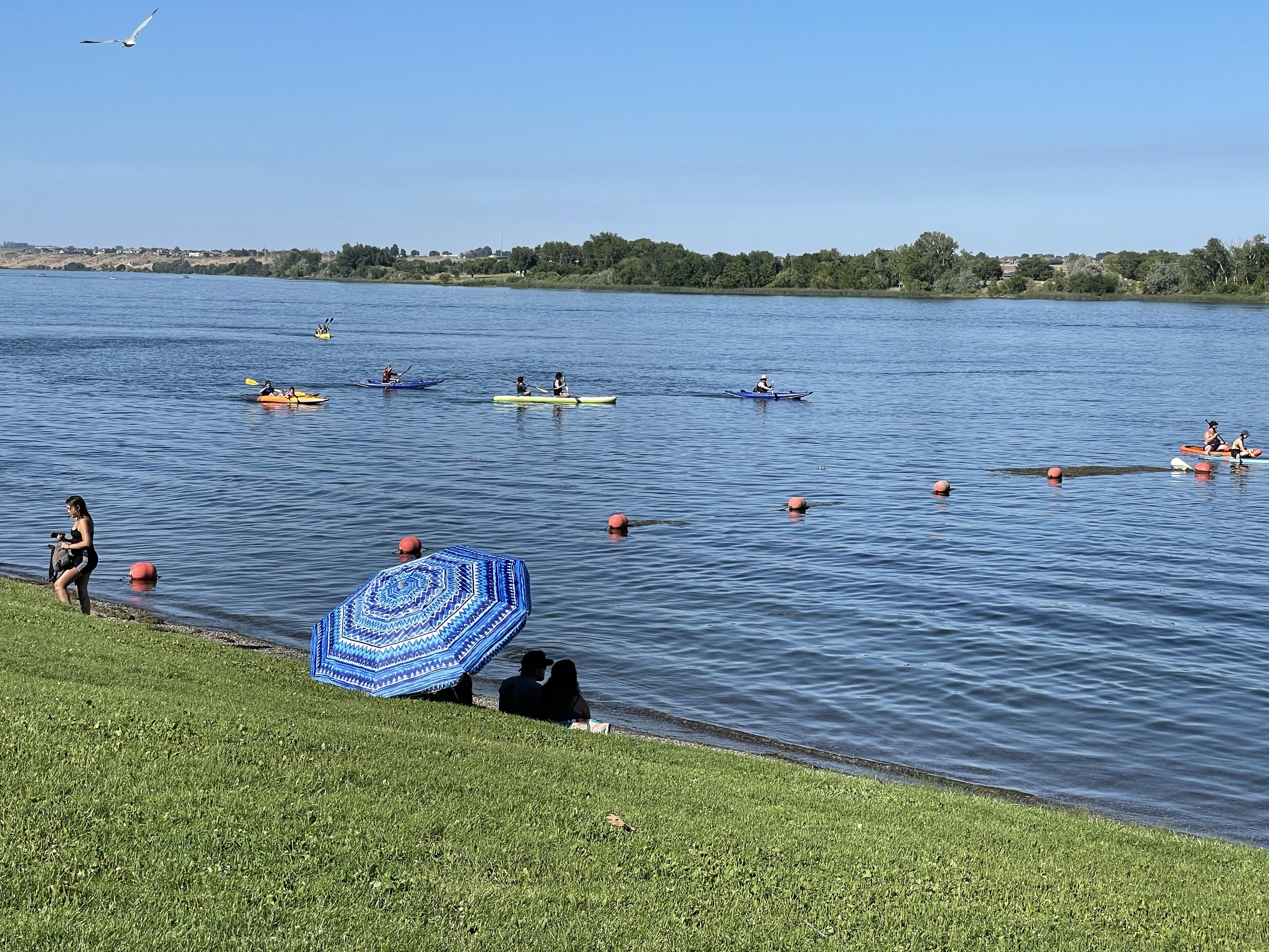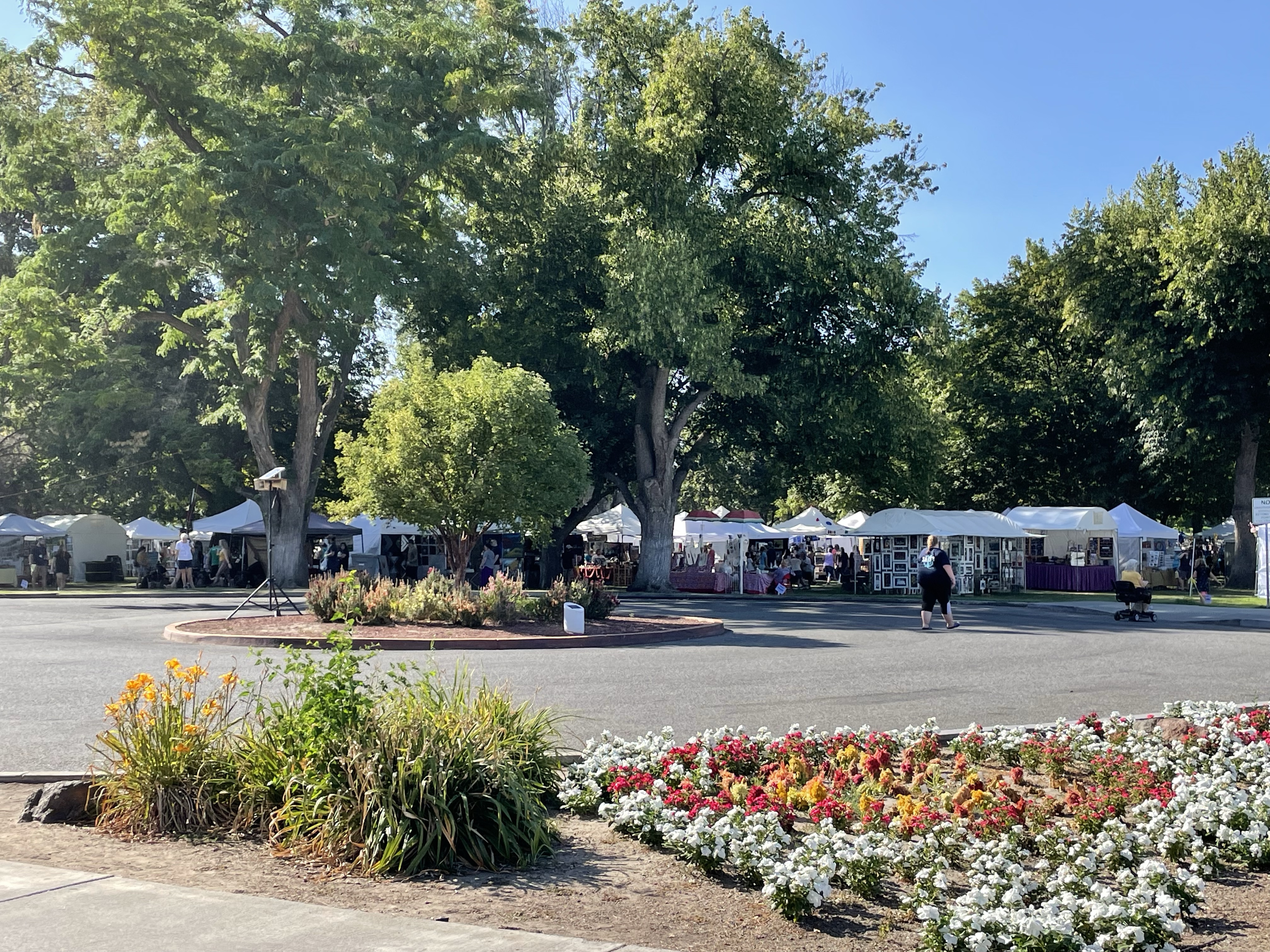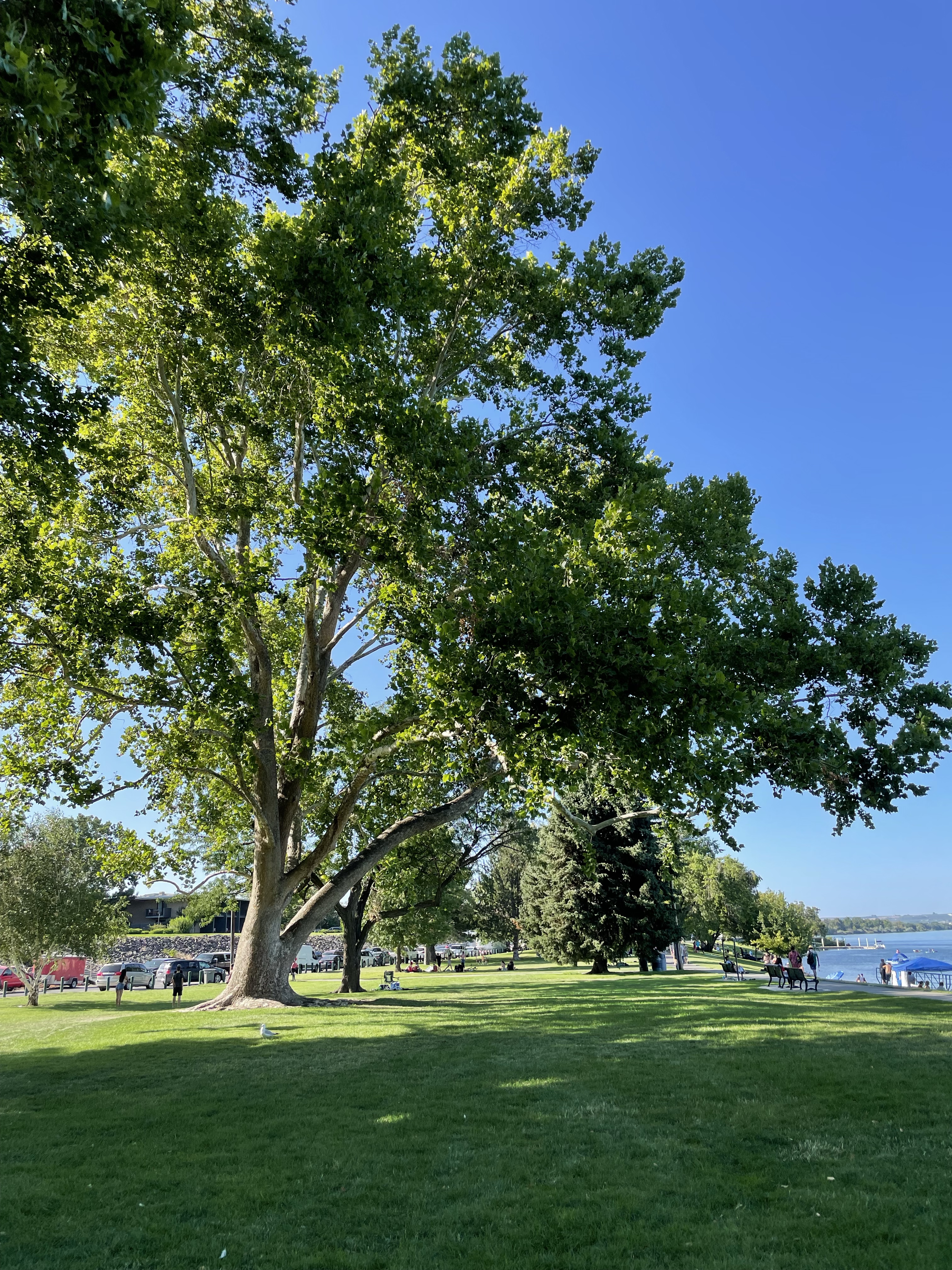 We arrive in Richland, Washington for the night and discover a quaint USA town. People are enjoying the hot summer day by swimming in the river, relaxing on the grass and visiting an art fair in the park. It is hot! Thank goodness for these HUGE American Sycamore trees shading us.