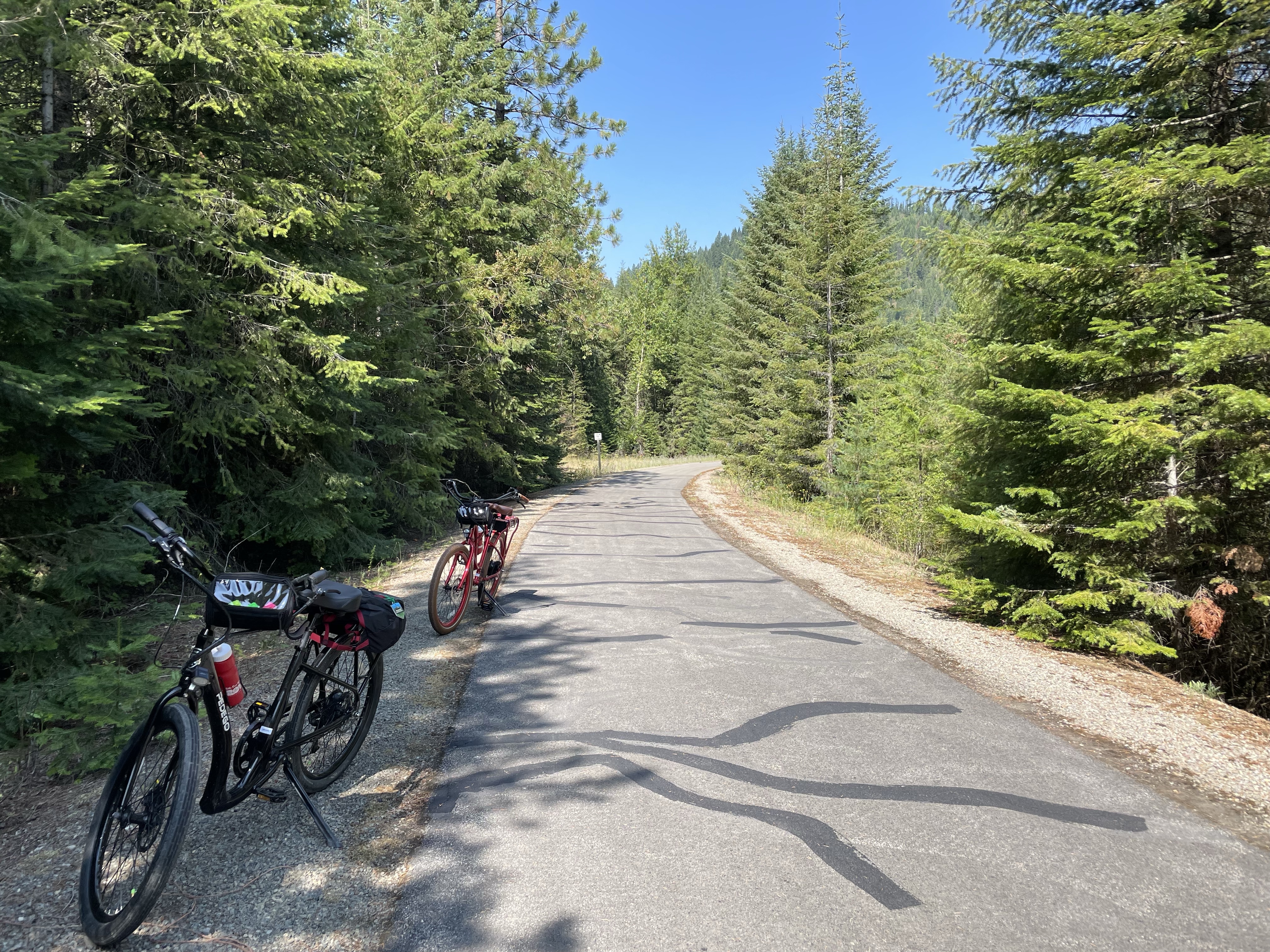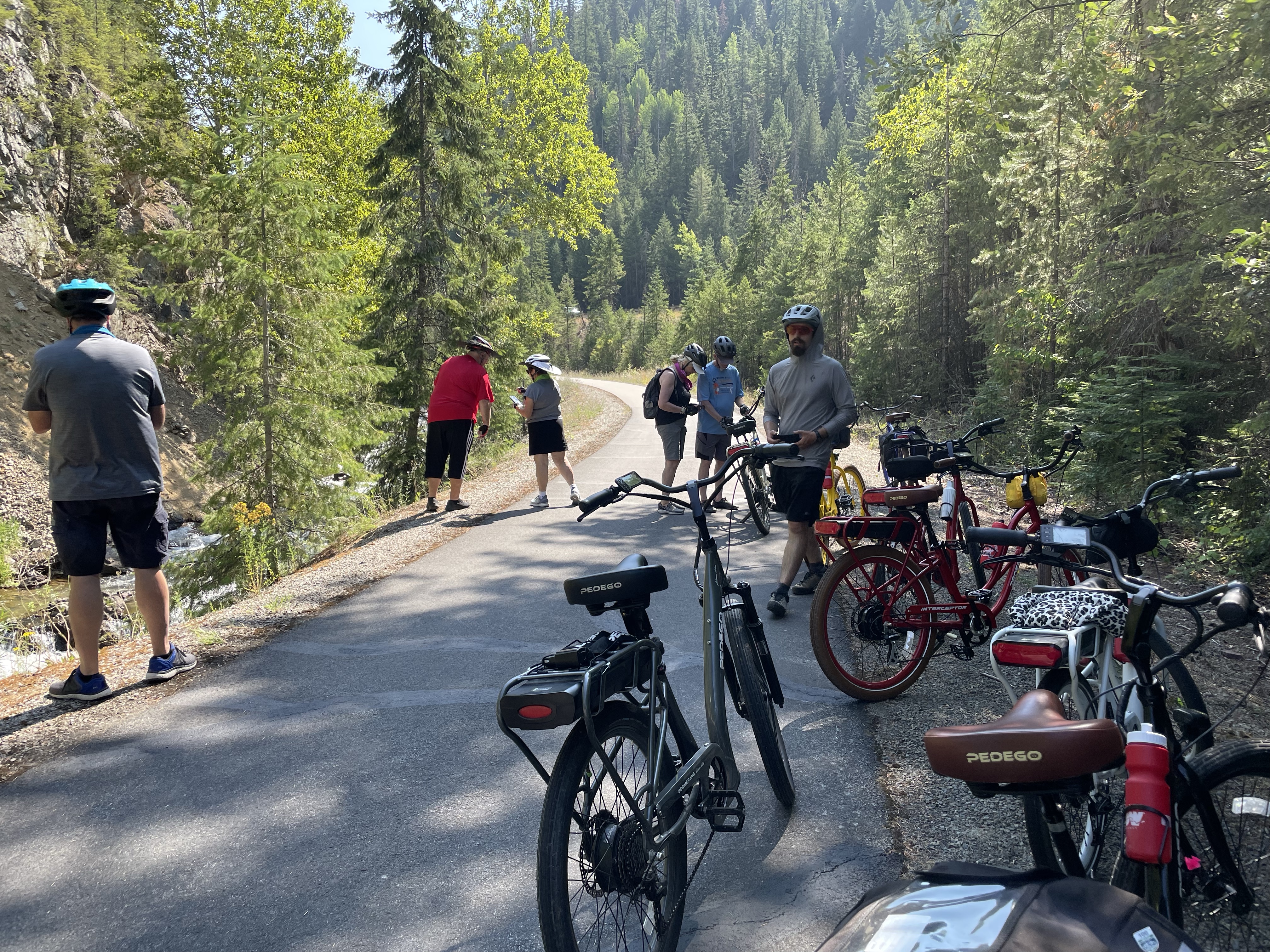 The week is flying by; we are enjoying the tour and the people we are meeting on the tour. Everyone seems to be prompt in the morning and ready to ride. The van unloads our bikes every morning and we load our ‘charged’ batteries from the night. Today we are starting right at the hotel to the Trail of the Coeur d’Alenes. The trail follows a creek in a pine forest. The views are lovely as are the smells from the forest.