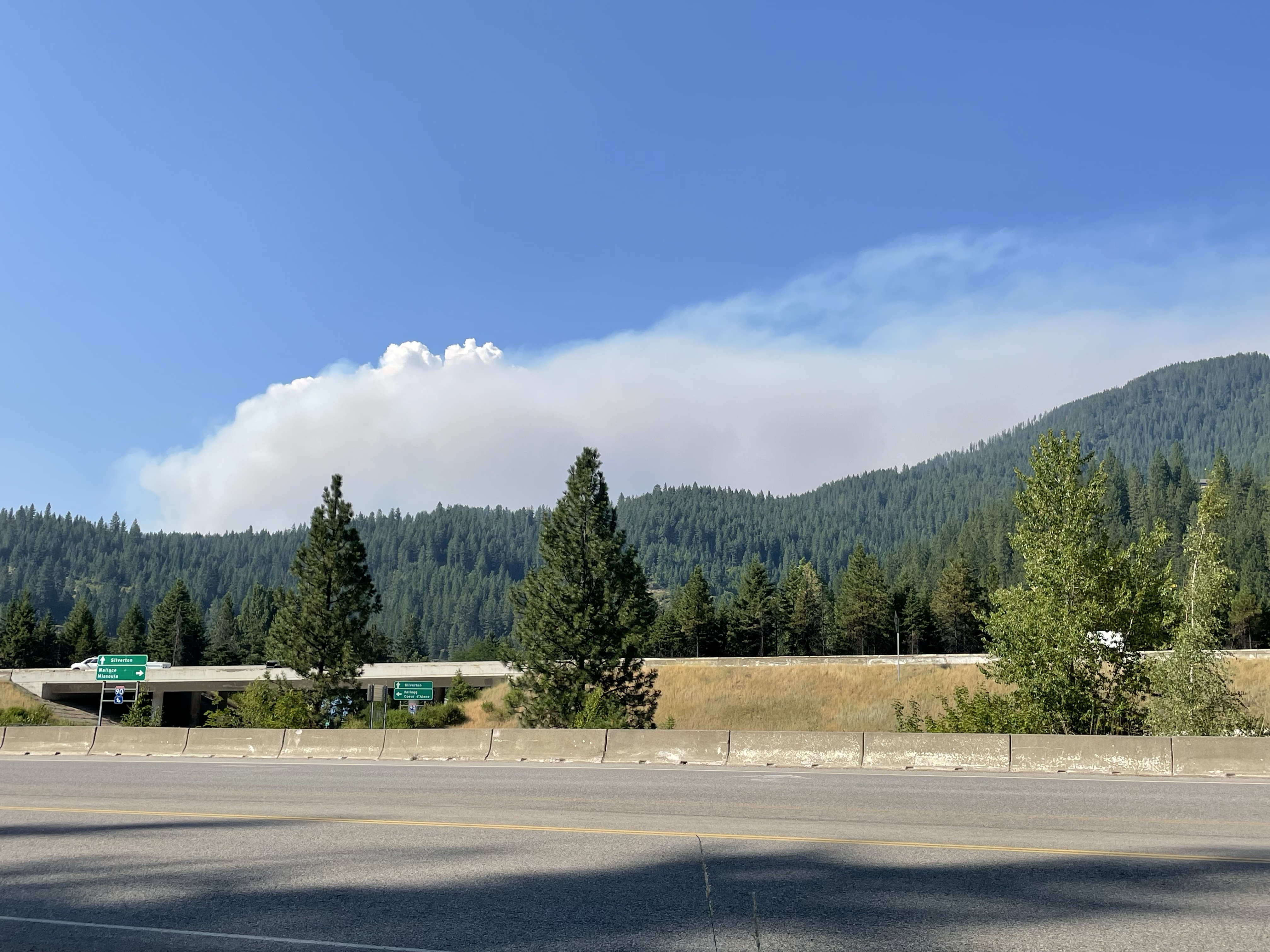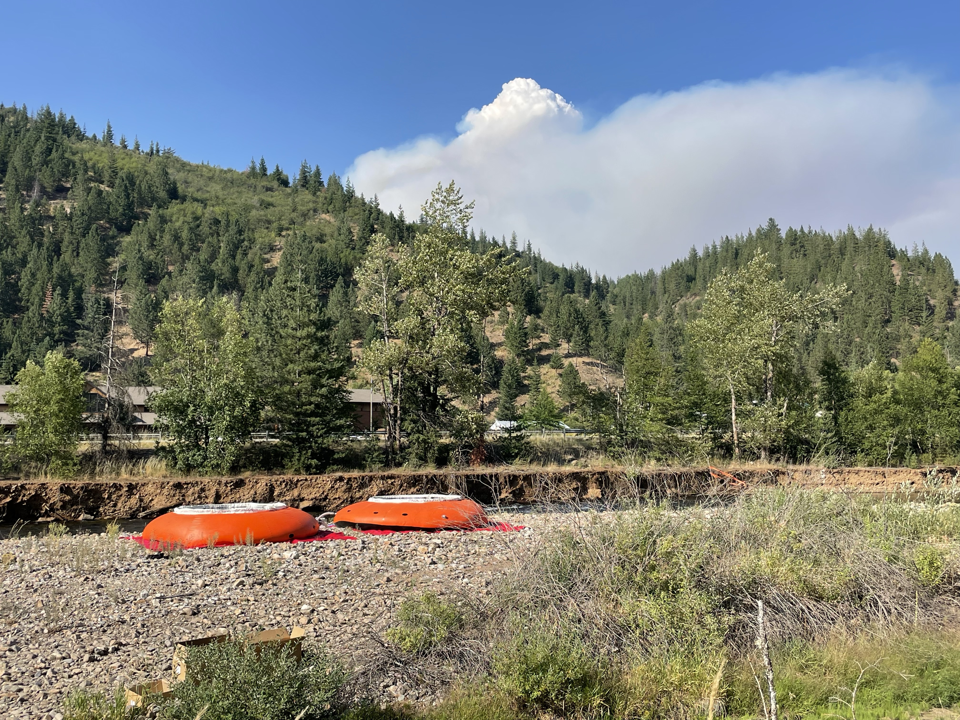 After the tour, we hop on our bikes and ride back to Kellogg and our hotel. Along the return trip, we see along the creek large collapsed buckets that will be used to fill and help put out forest fires. This entire week we have been blessed with no smoke or fires. Unfortunately, there is now a fire north of us; we can see the smoke rising above the mountain top. A helicopter with a filled water bucket flies overhead. No smoke yet in our valley with the favorable southern winds.