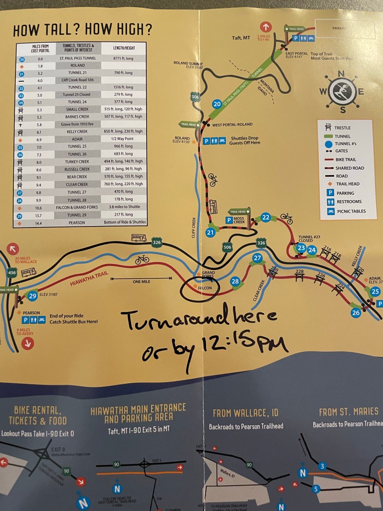 Our guide has us ride from the start at Lookout Pass to Falcon. This trail map shows the location of each of the tunnels and trestles. Also, note we are in Montana now and cross back into Idaho on the trail.