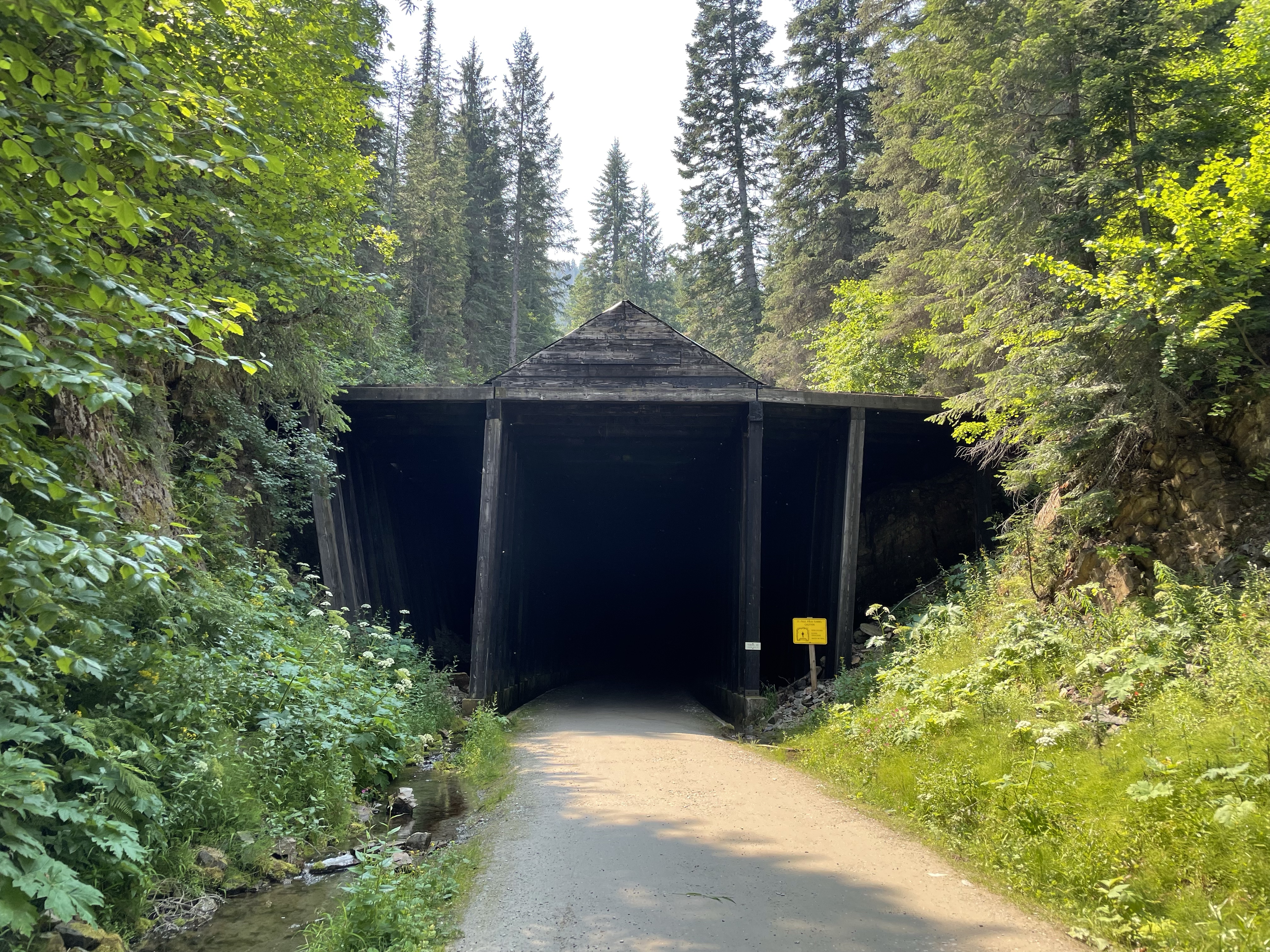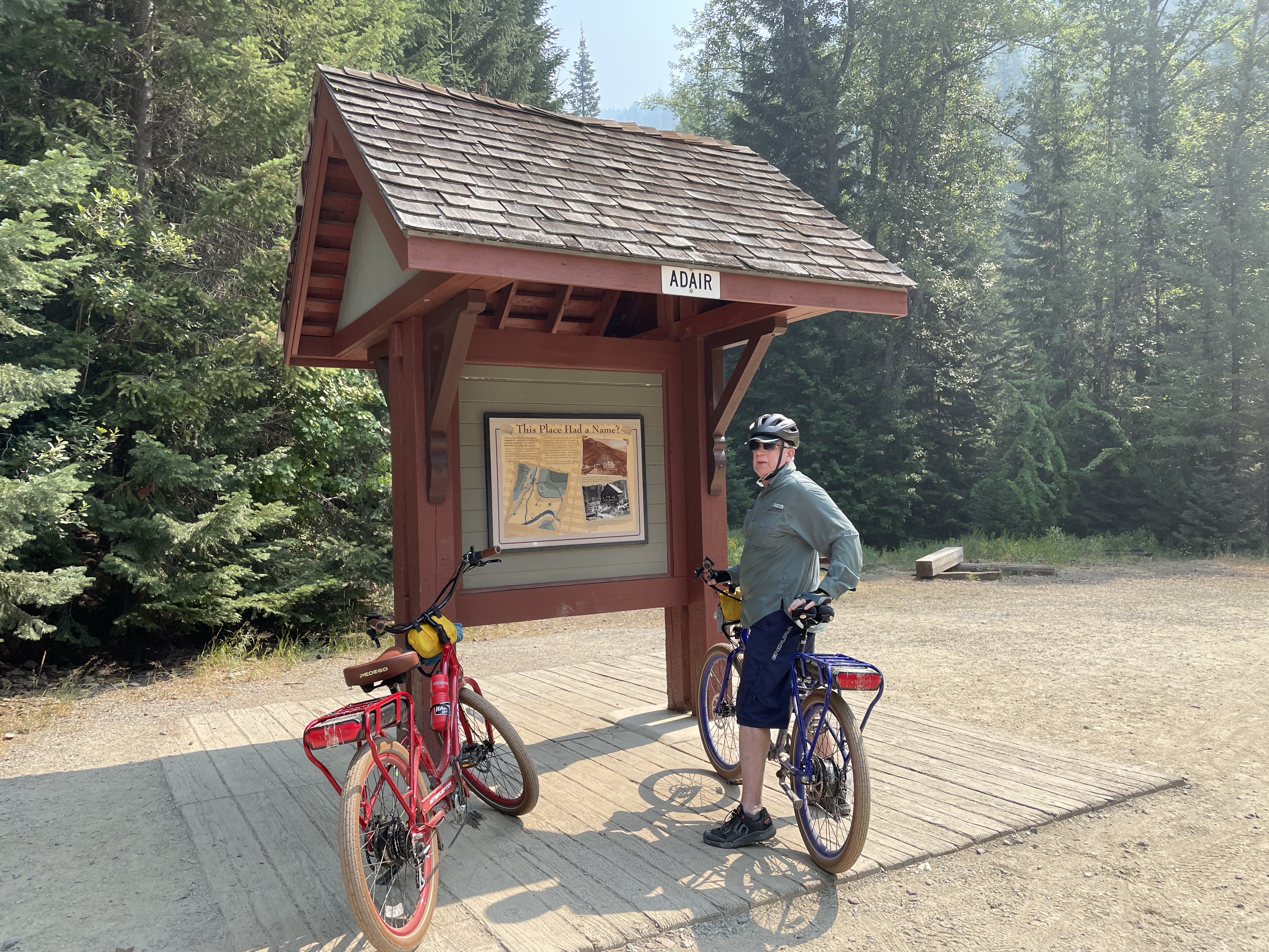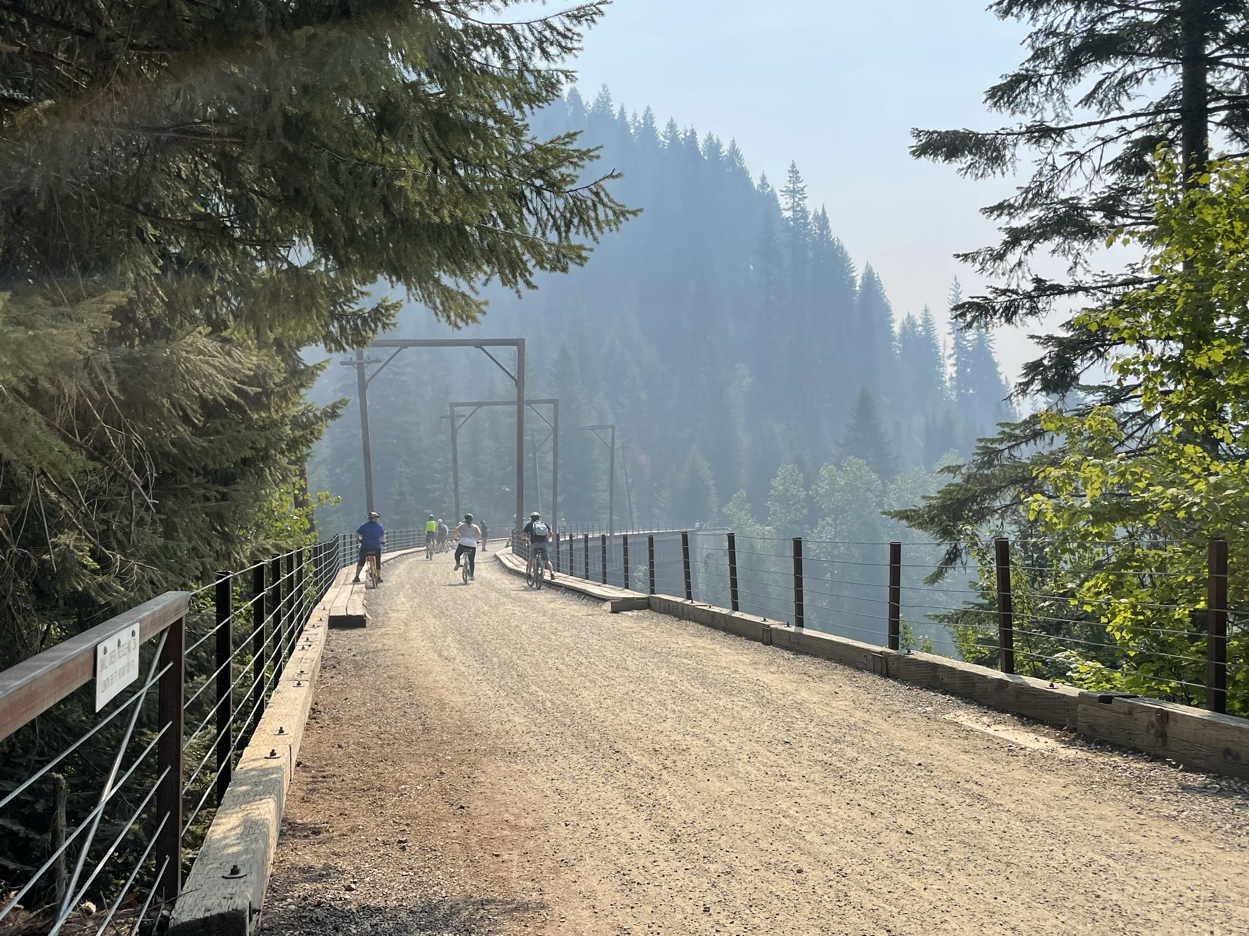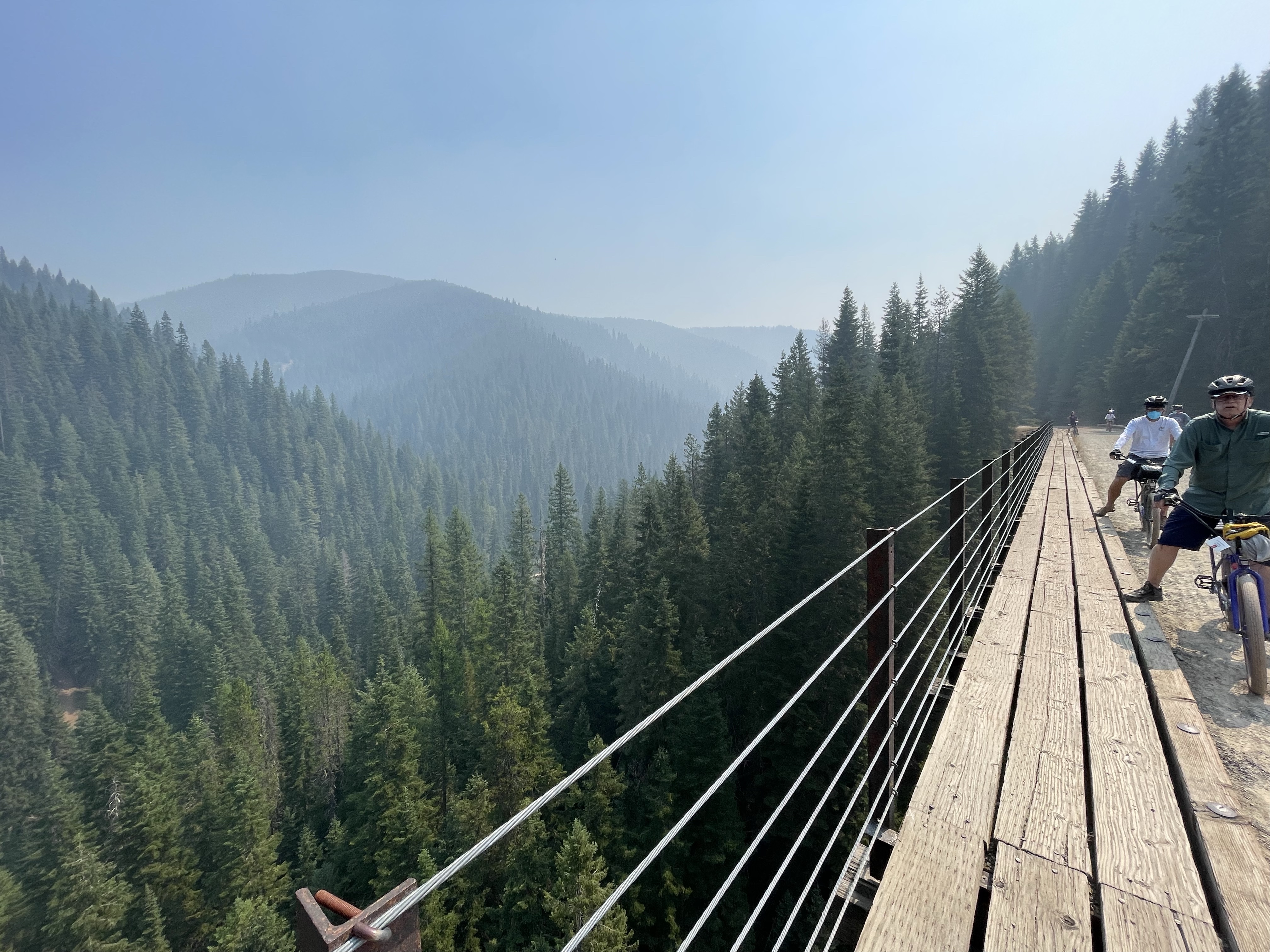It is hard to believe this is the last day of our bike tour by Row Adventures on Pedego electric bikes. Our two tour guides have taken good care of us and our machines. Our bike trail today is the Hiawatha – the ‘crown jewel’ of rails-to-trails. Formerly the Milwaukee Railroad’s train line from Chicago to Tacoma, built through the mountains with tunnels and trestle bridges. The Hiawatha at Lookout Pass has 7 trestles and 10 tunnels to ride through. Beautiful scenery obscured somewhat today by the smoke in the air from the fire we saw in the distance yesterday. A bonus just as we take the road into the parking area, we see a moose.
