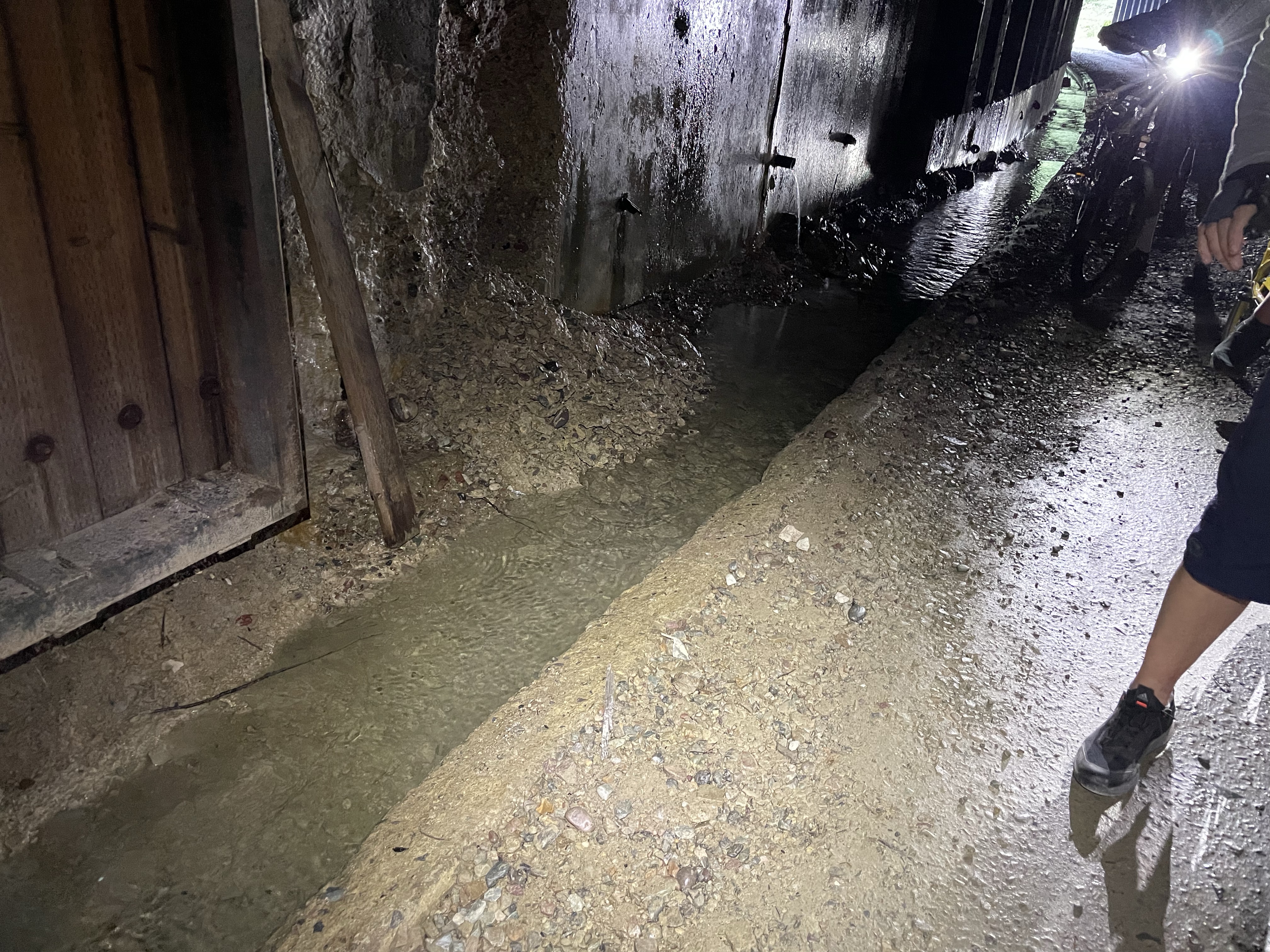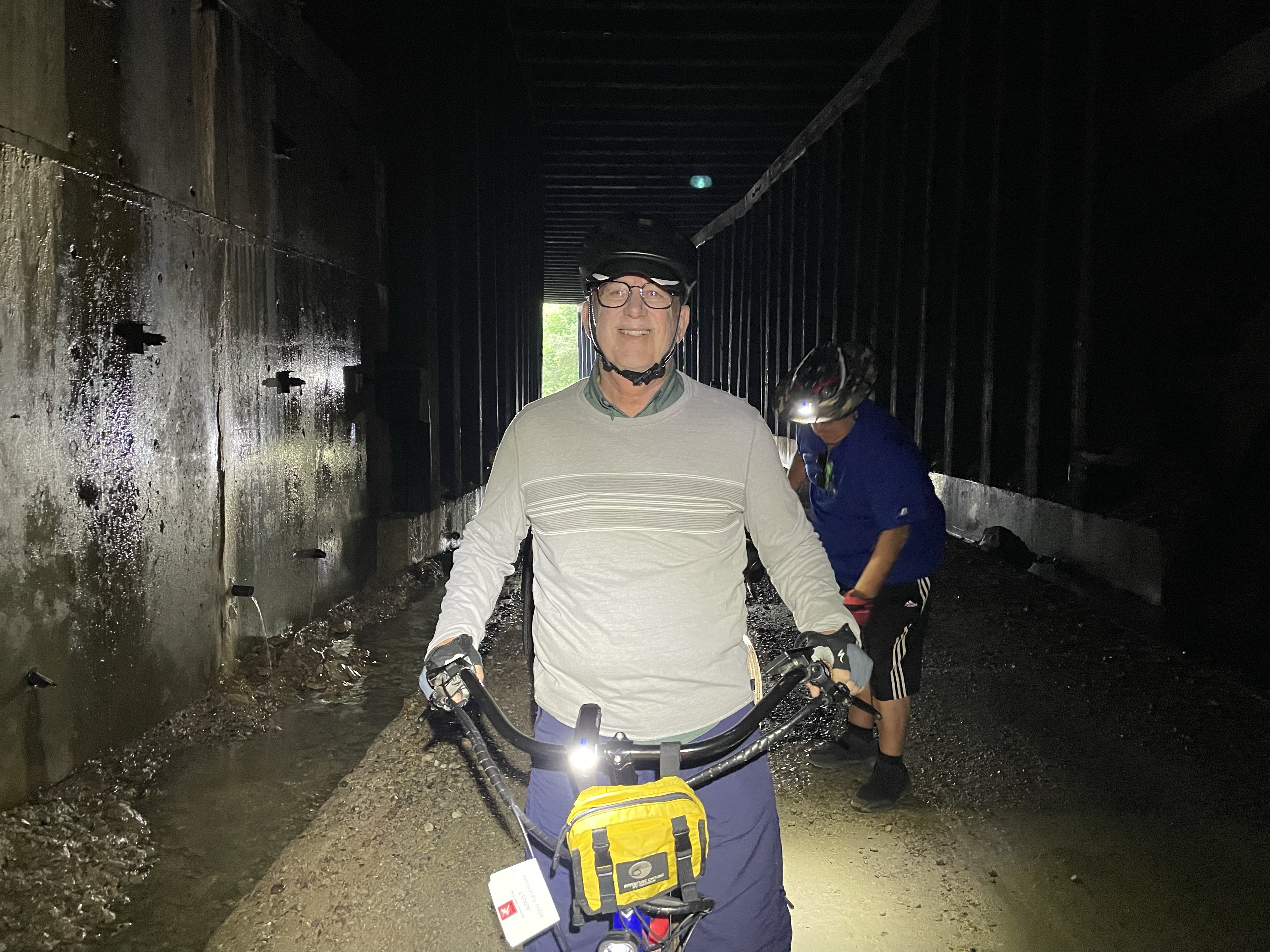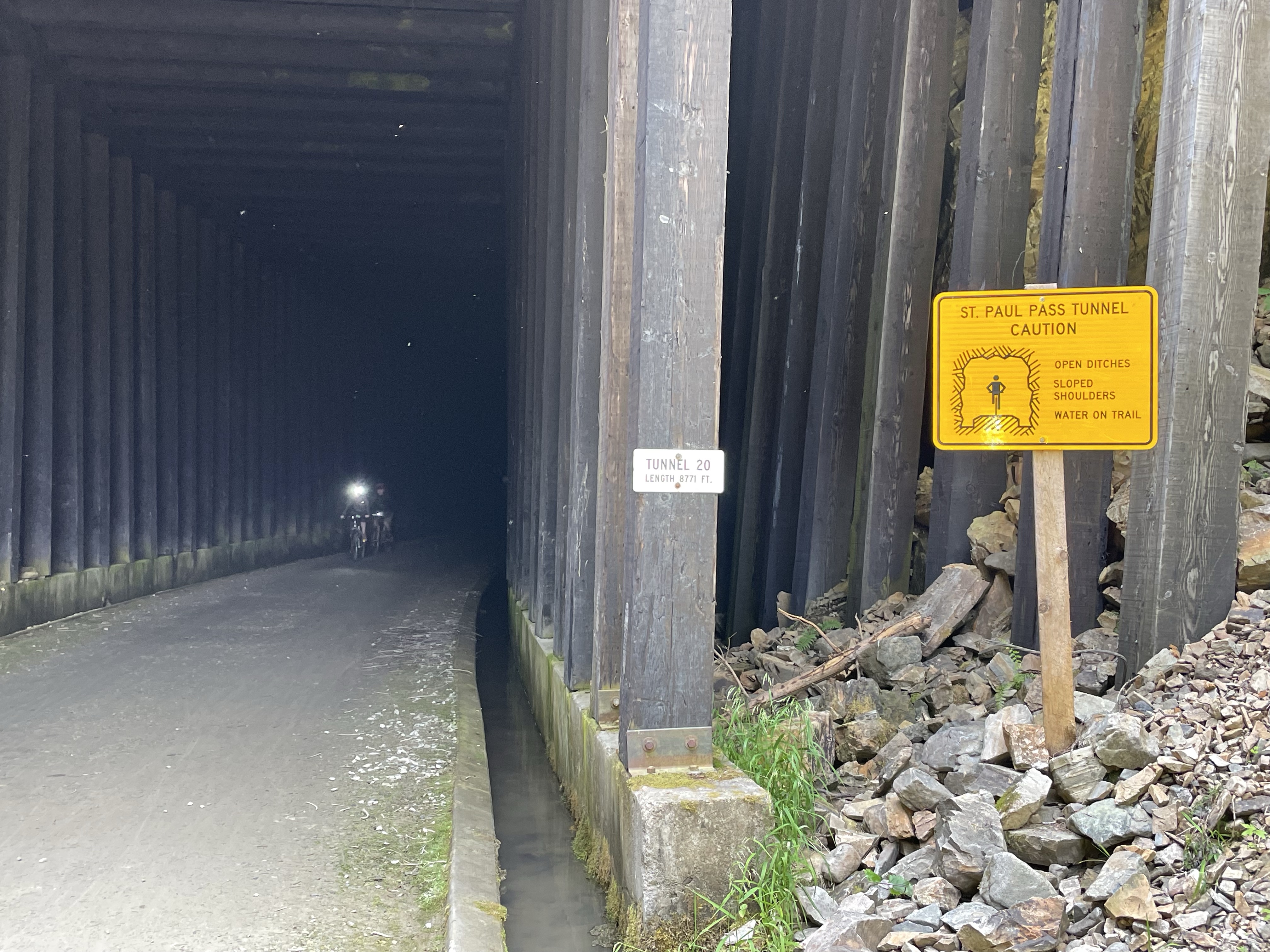 We are given head lamps for our helmets and there is also a light on the bike. The incredible first tunnel is 1.66 miles long, very dark with running water coming off the walls and ditches along the sides to capture the water. Mucky is the only word to convey the condition of the trail inside the tunnel.