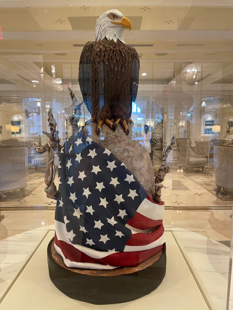 The rain is starting so we head back to the hotel. The lobby always has an amazing chocolate sculpture; this time an sitting eagle and USA flag. Nice.