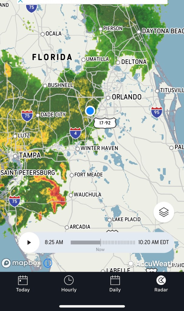 Today was suppose to be Disney Animal Kingdom and dinner at Topolino’s. Instead, the sunshine state is receiving a drenching of rain all day from a front bringing rain across the state from the Gulf of Mexico. Time to head home a day early.