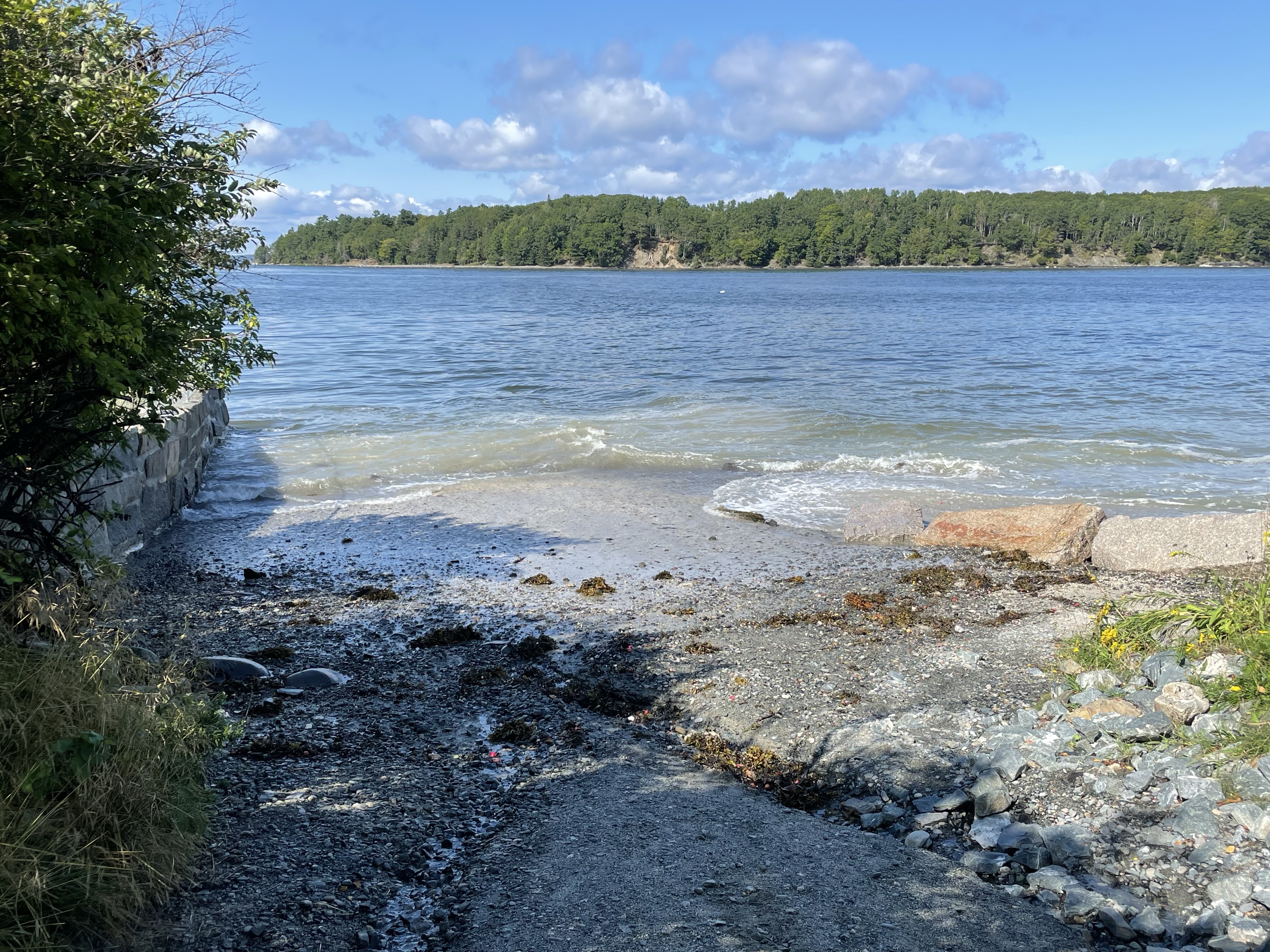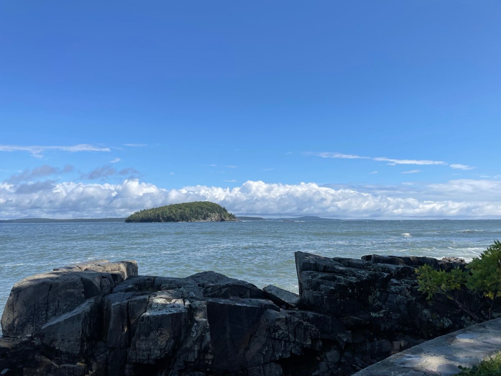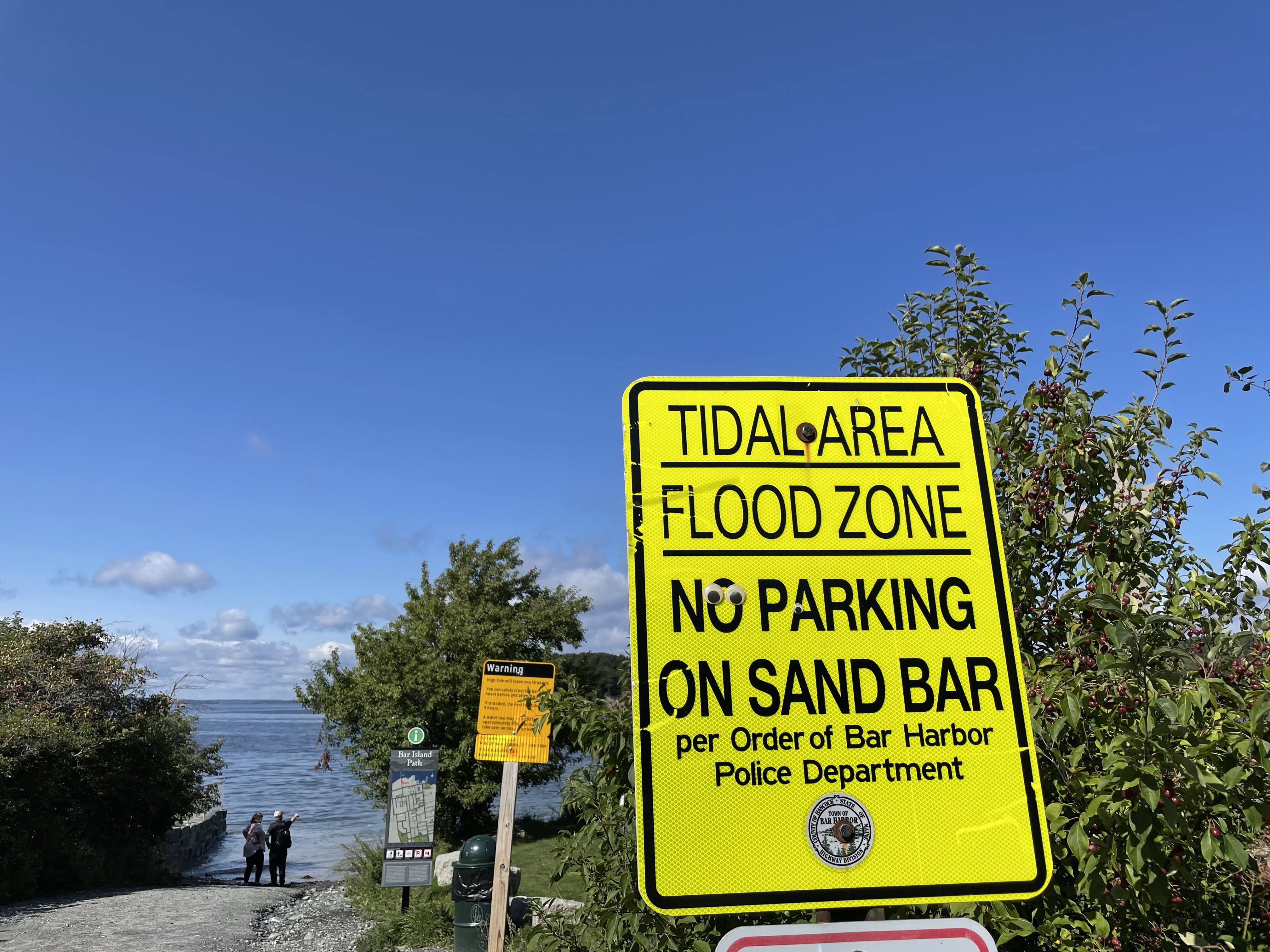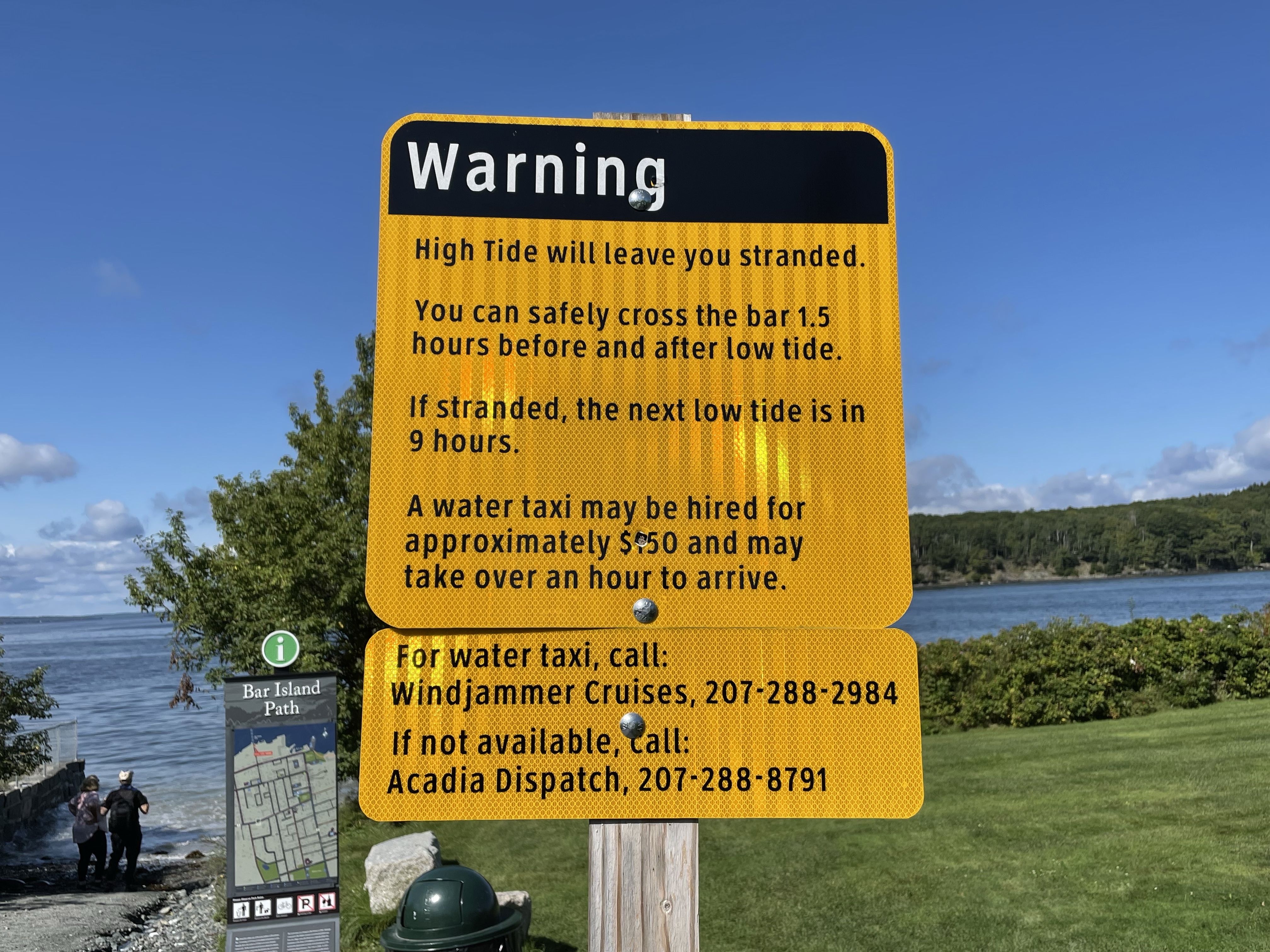 Bar Harbor is known for having a bar of sand and stone that is visible in low tide that you can cross over to the island. We walked down the street to the ‘bar,’ it is high tide so no bar is visible. Check out the warning signs.