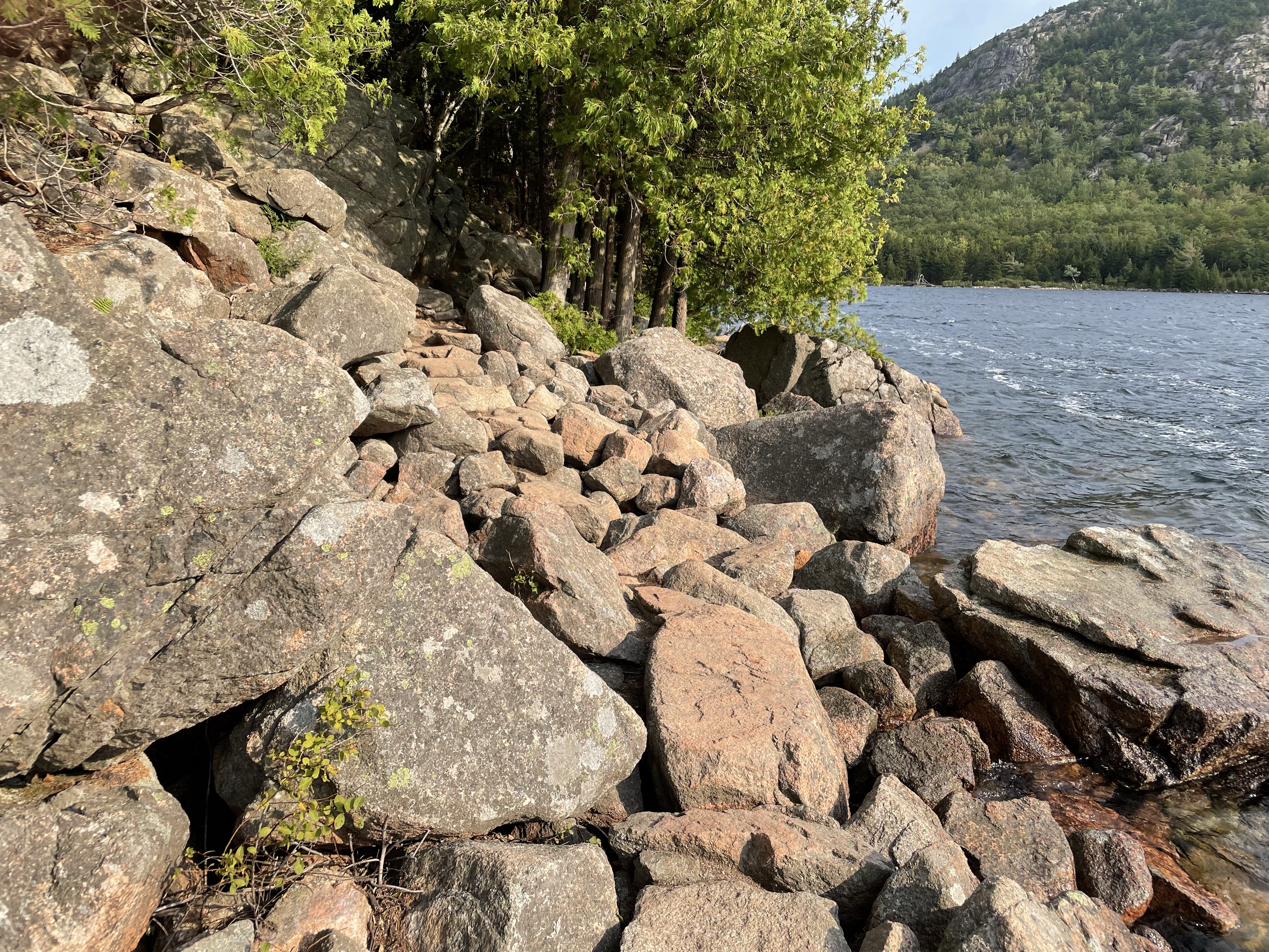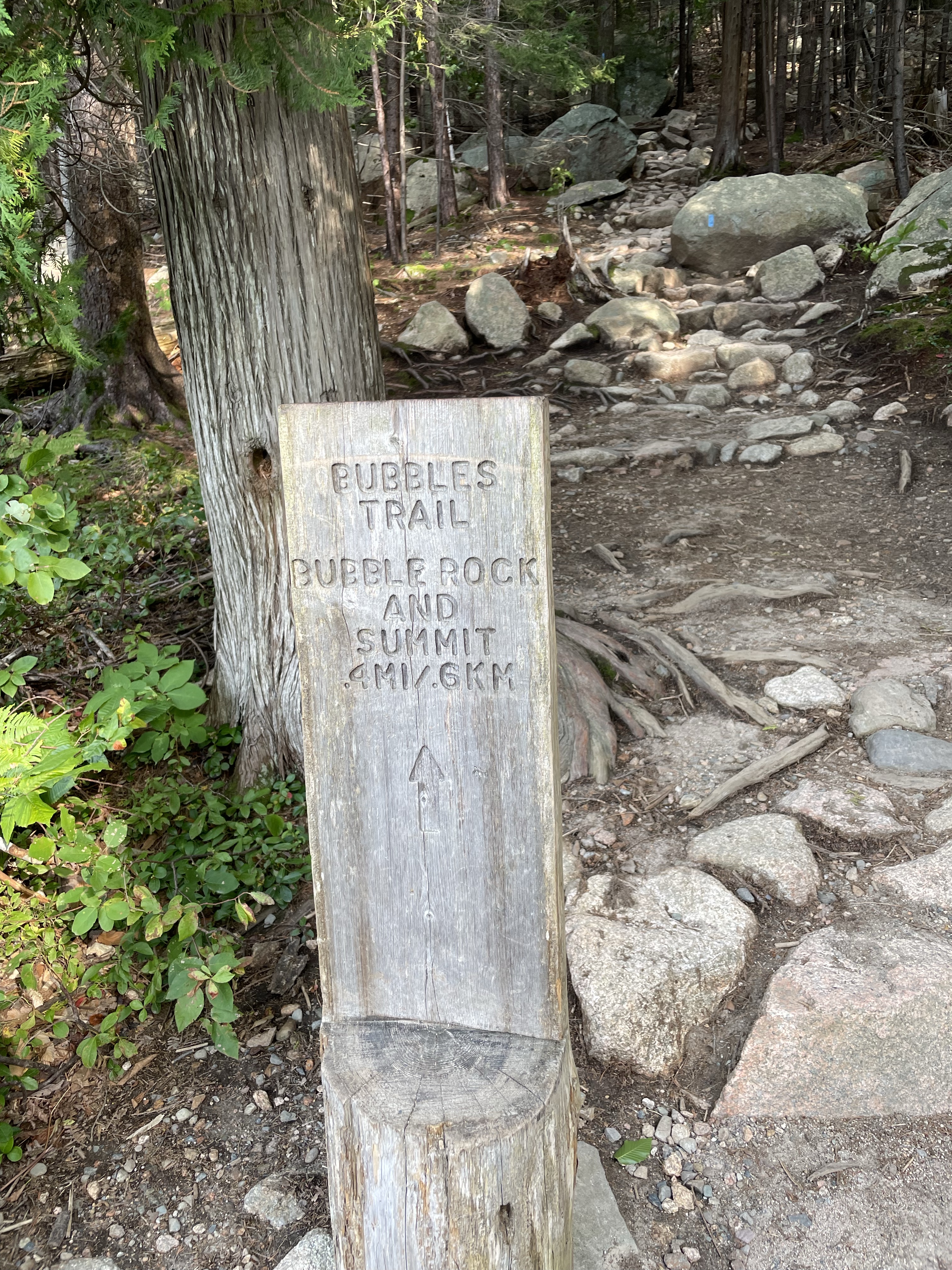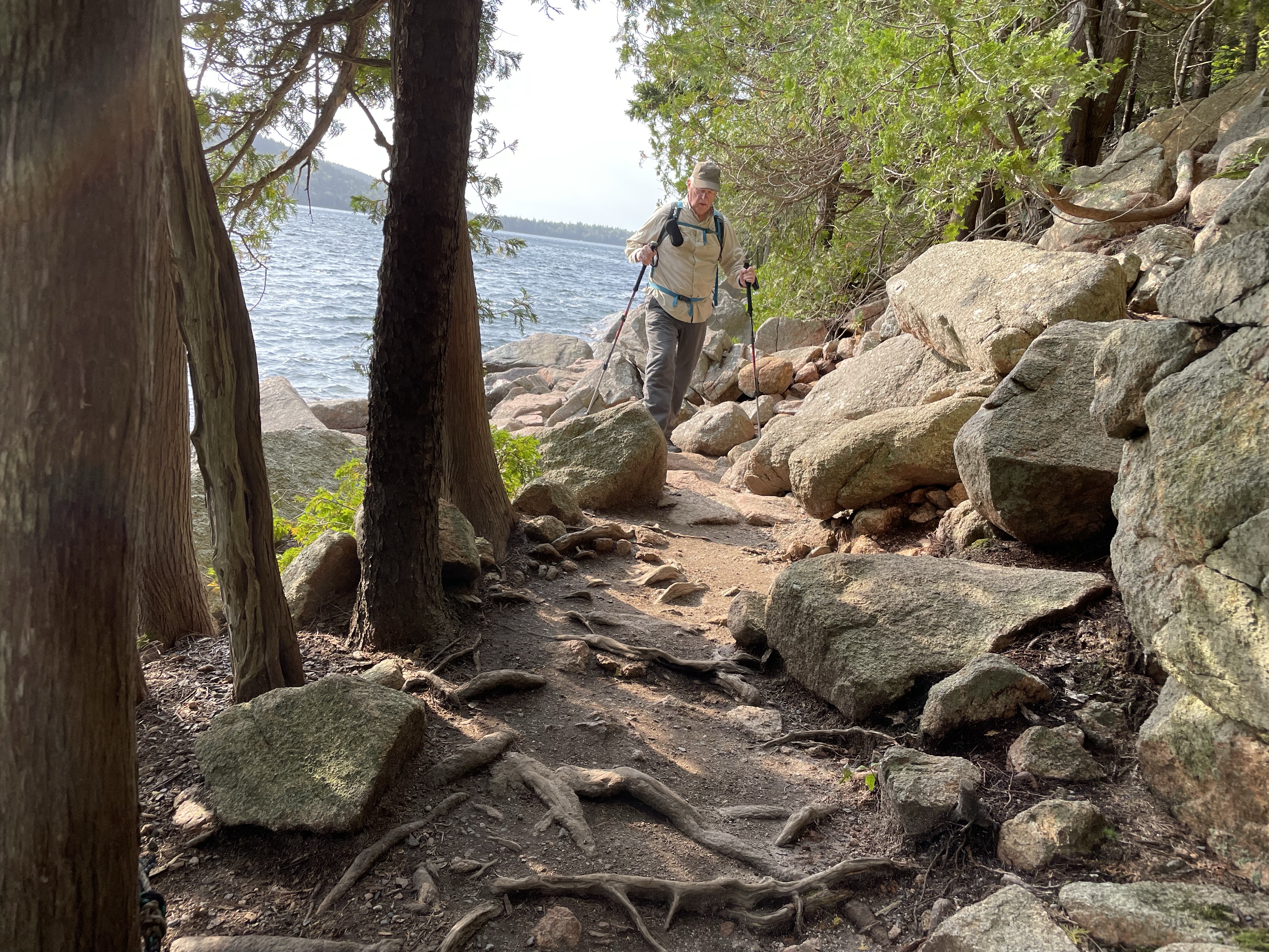 And if you are going to eat a lot, you need to hike a lot……Off early in the morning to Jordan Pond. Last week we couldn’t even see the Bubble Rocks across the pond. We walk the path around the lake. When we arrive at the sign for Bubble Rock hike, our friends decide to hike up. We meet back along the trail and then continue back to the Jordan Pond House.