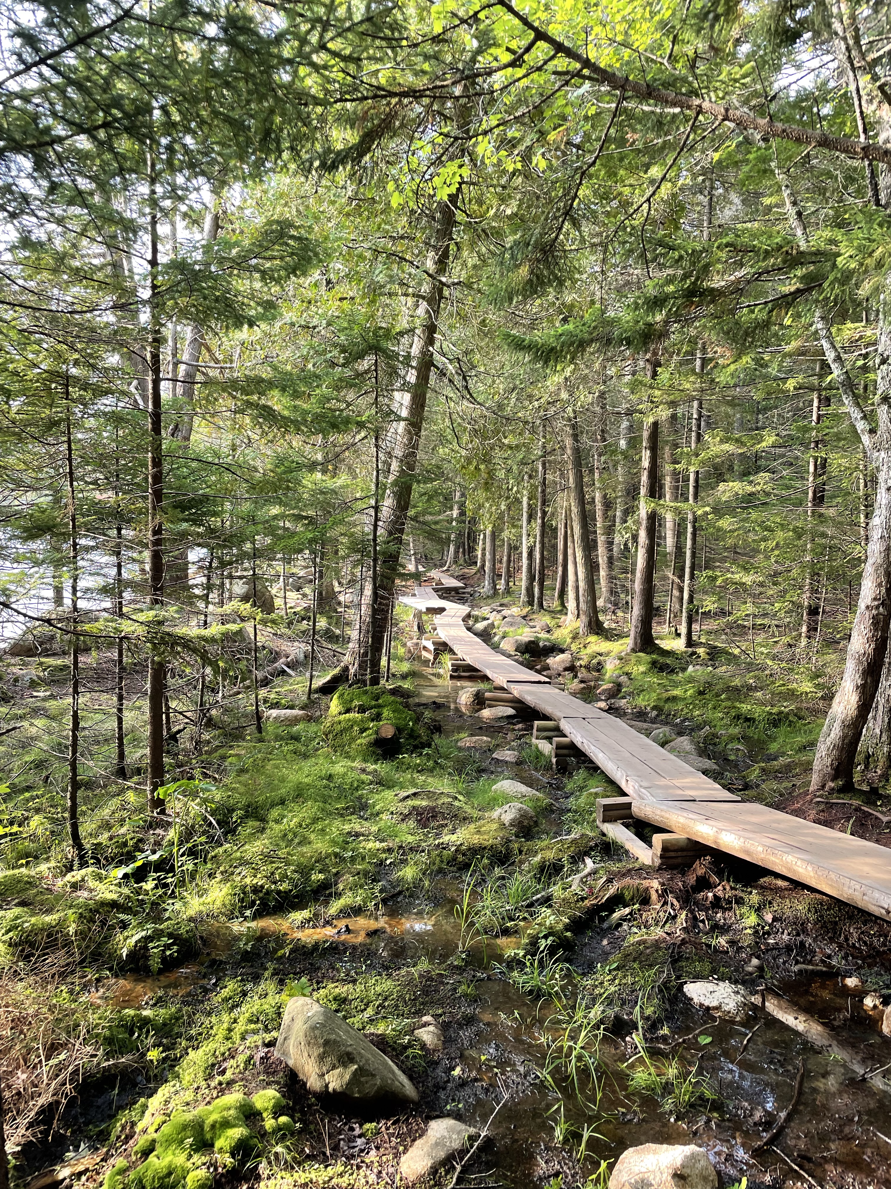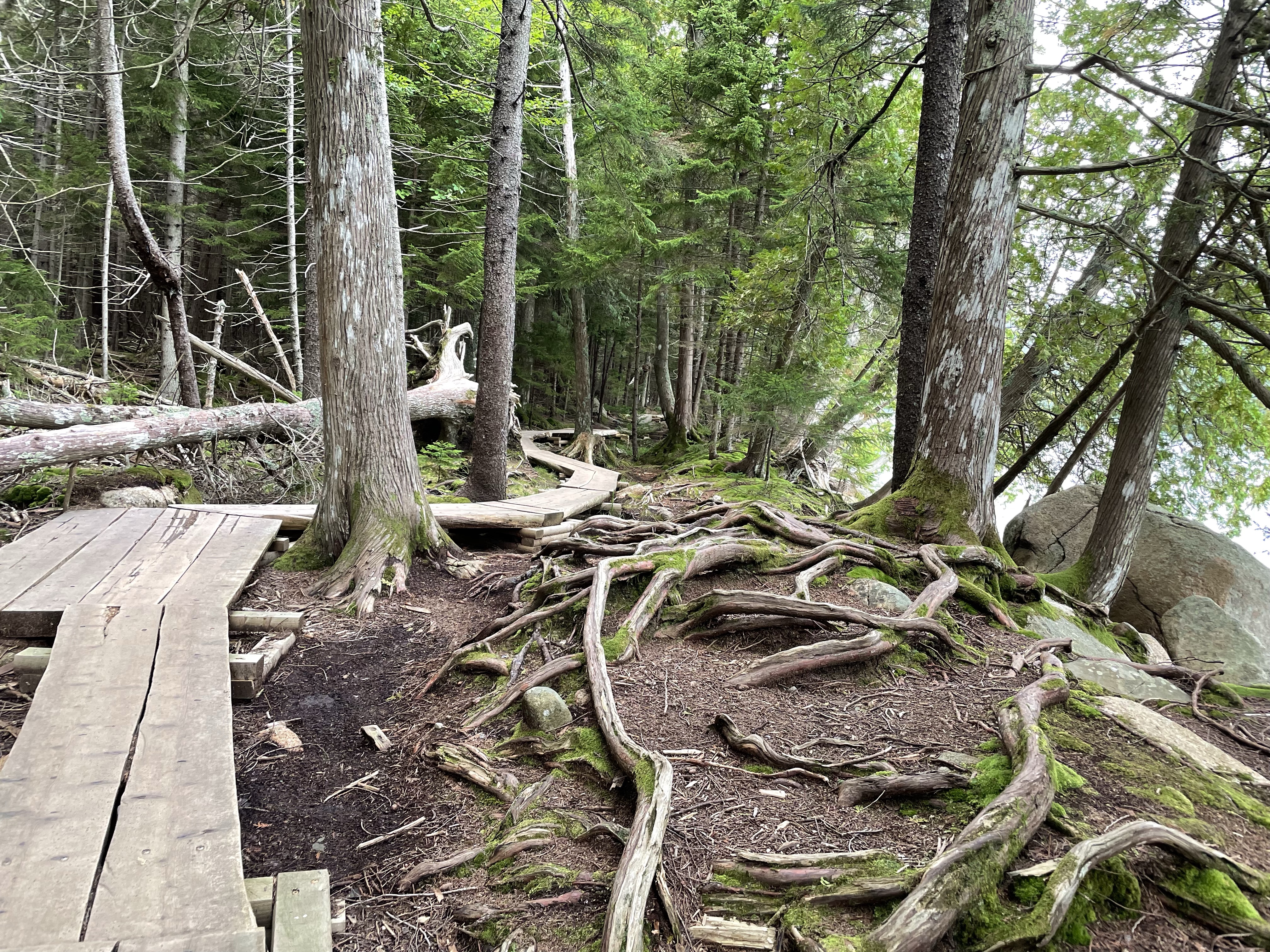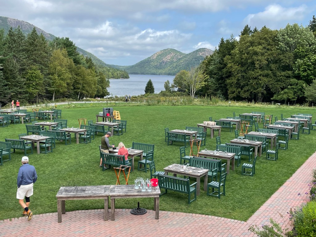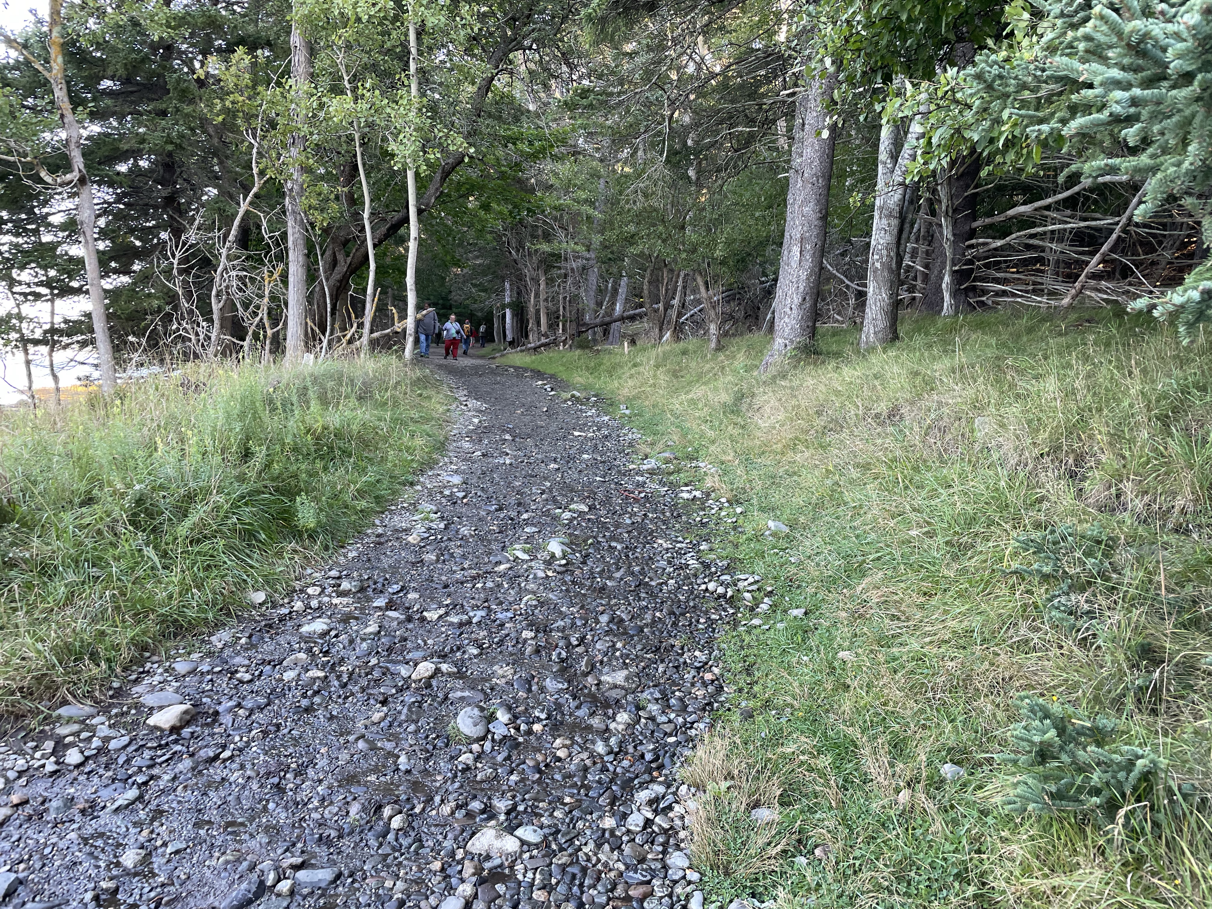 And if you are going to eat a lot, you need to hike a lot……Off early in the morning to Jordan Pond. Last week we couldn’t even see the Bubble Rocks across the pond. We walk the path around the lake. When we arrive at the sign for Bubble Rock hike, our friends decide to hike up. We meet back along the trail and then continue back to the Jordan Pond House.