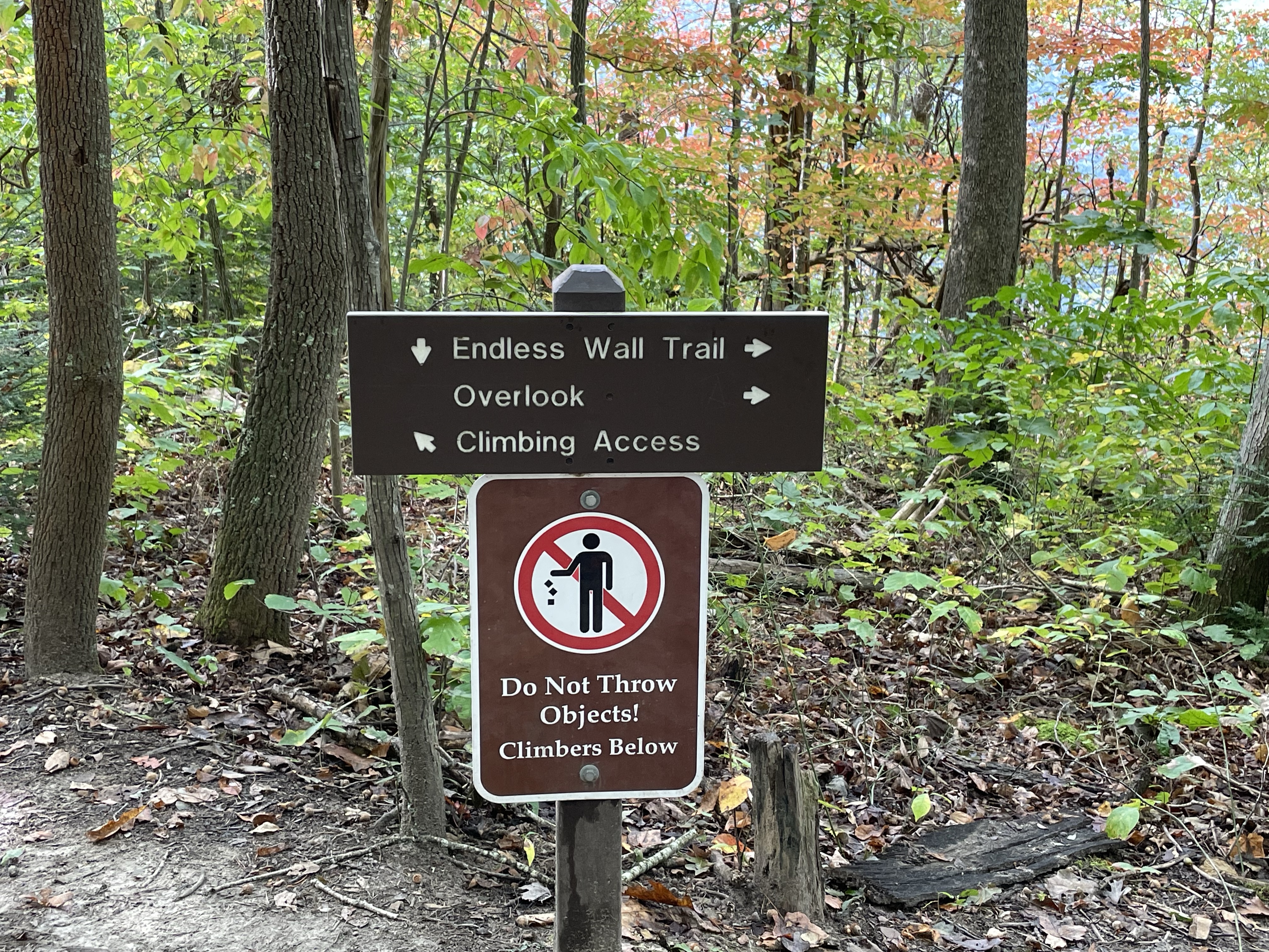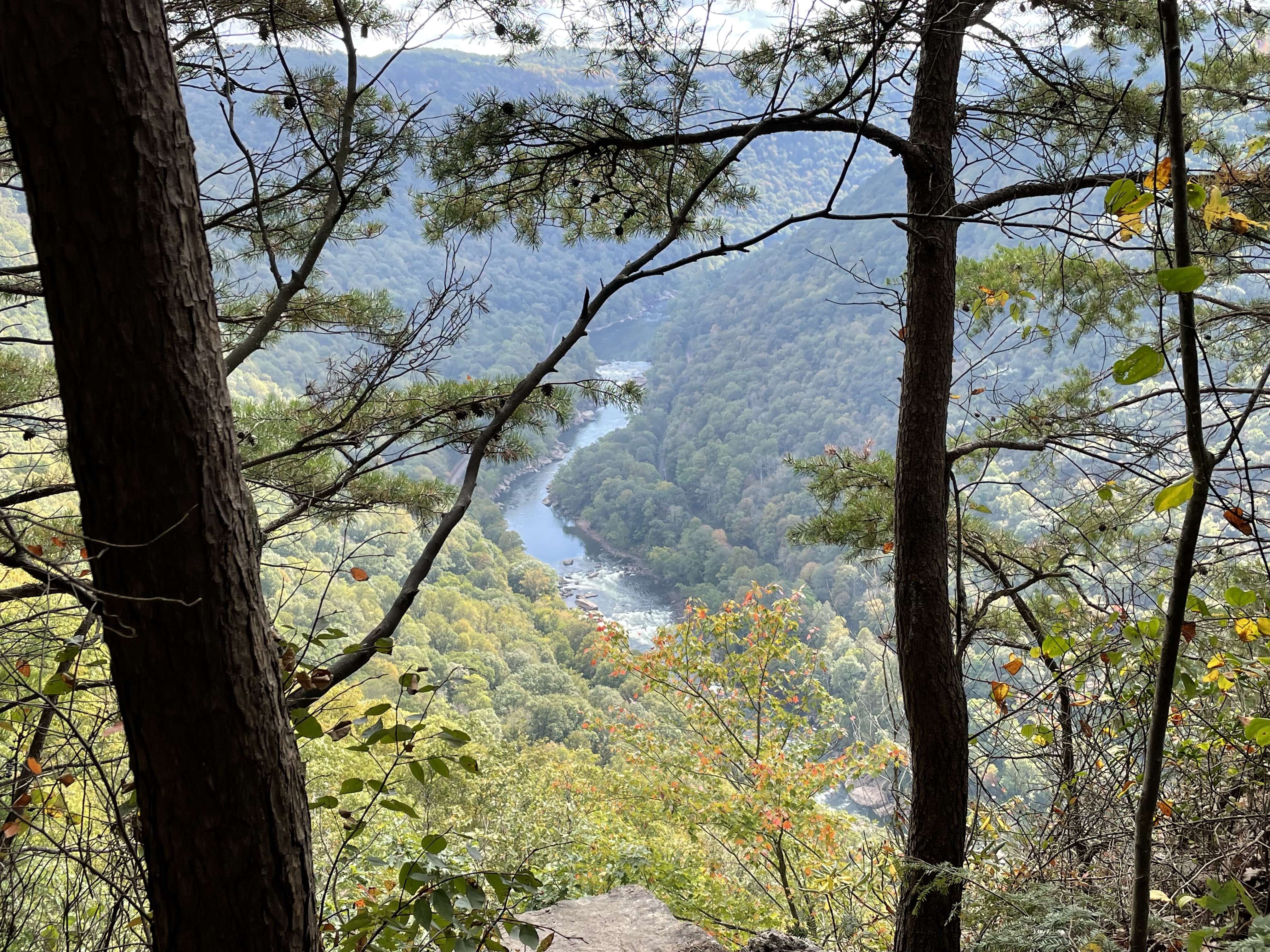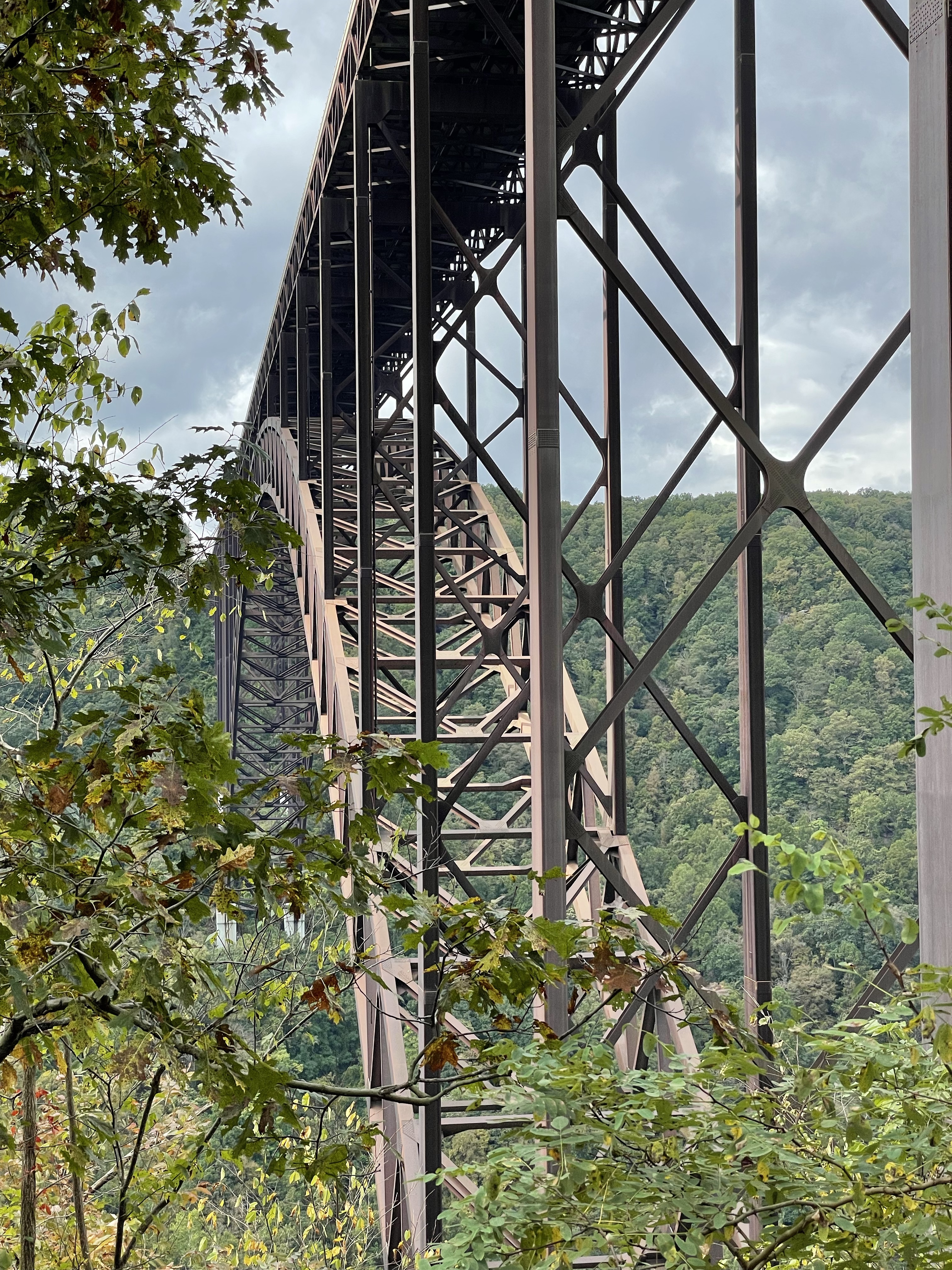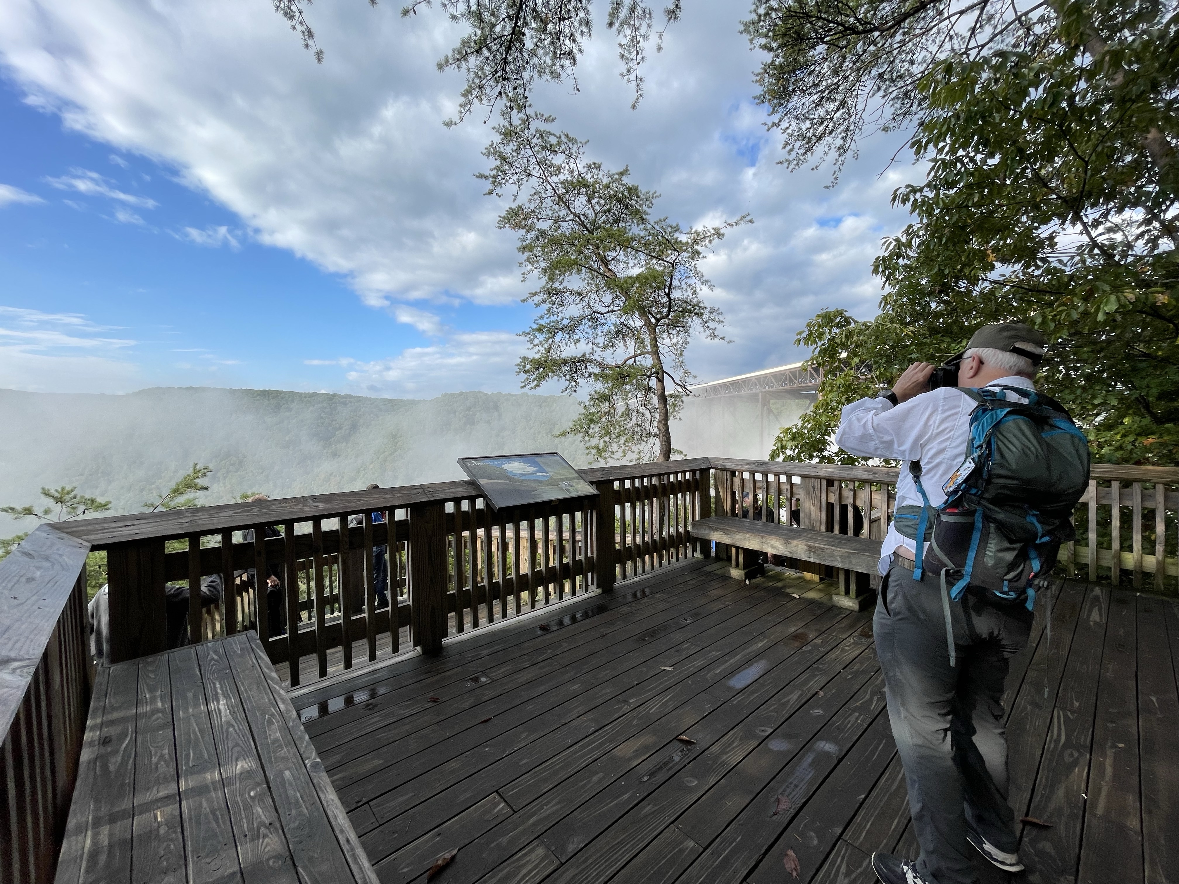 The National Park ranger also suggested a hike – the Endless Wall Trail. Only 2.5 miles through the forest and out to Diamond Point overlook of the river and the bridge. The trees are continuing changing into their beautiful Fall clothing, the hike was easy, there were few people on the trail, and those who were there were experienced hikers and a joy to be with. Nice.