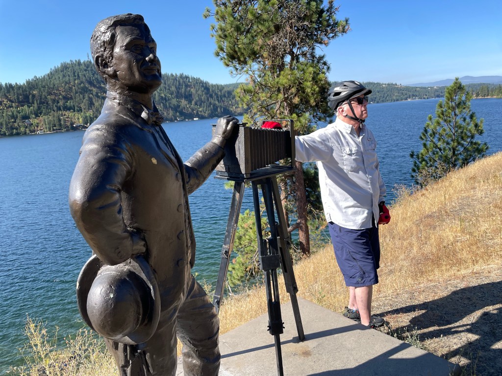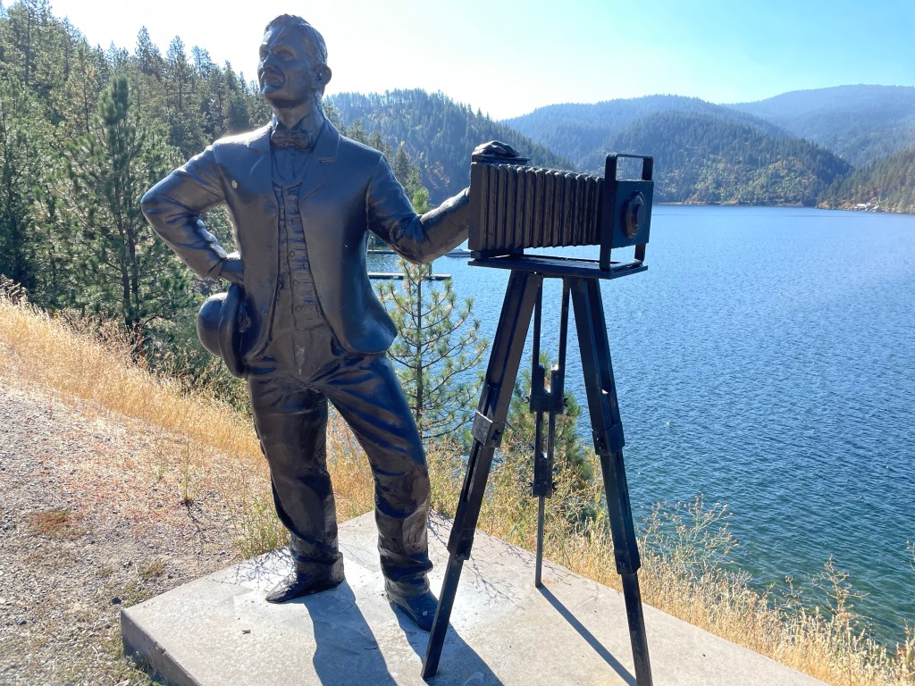 At Higgins Point is a statue of “Leopold,” the sculpture of a 19th-century photographer by Coeur d’Alene artist David Clemons. The statue has graced the shoreline of Lake Coeur d’Alene for many years. The camera is poised as to capture the beauty of the lake all year. This spot was picked because many photographers come to this point to photograph bald eagles eating the spawning salmon.