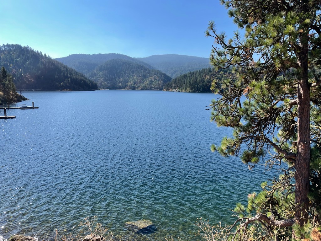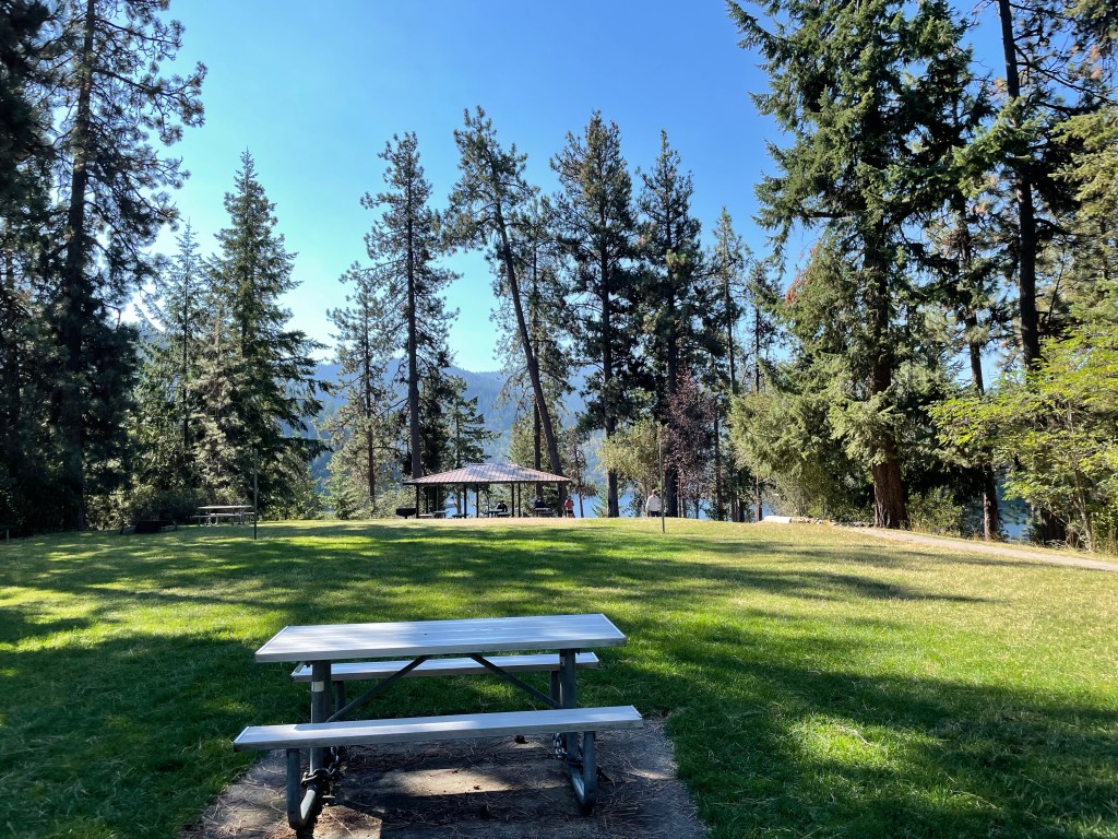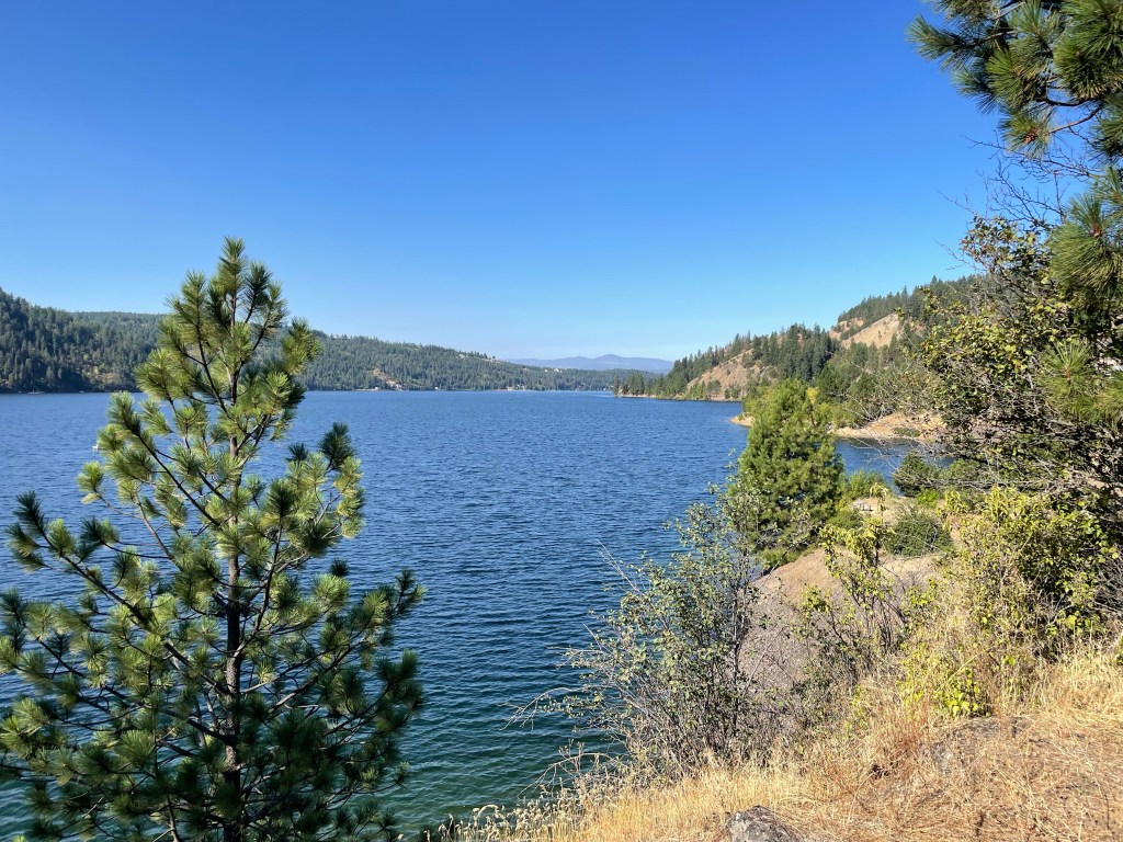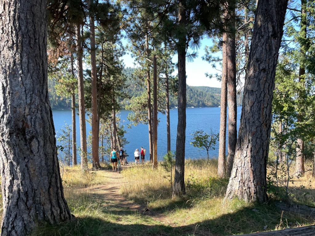 Now we follow the trail along the beautiful lake until we reach Higgins Point. Lake Coeur d’Alene is 25 miles long and is named after the French name – which translates to “sharp as an awl” – for the Native Americans who lived in this area; evidently they were clever and hard-nosed traders. Below are a few nice lake views. Last year when we did this ride it was cloudy. So nice to see blue sky and water.