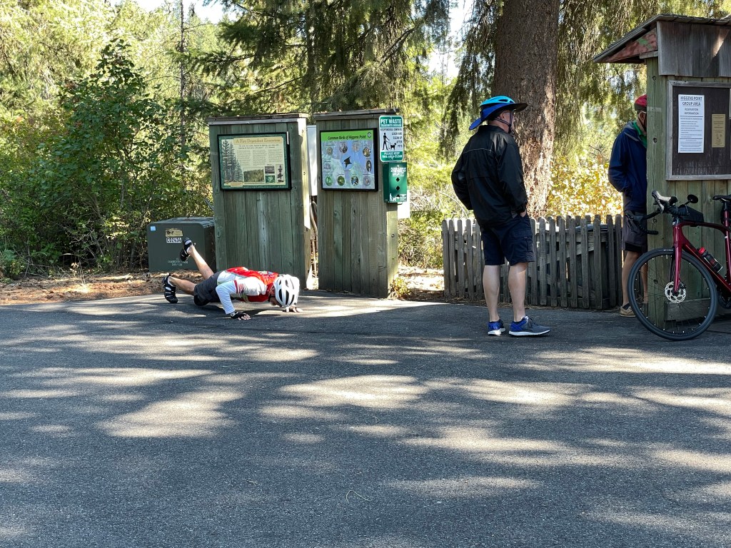 Today’s strange picture is of a road bike person completing the ride to the end of the trail and then getting down on the ground and doing one-legged push-ups. Never saw this before!