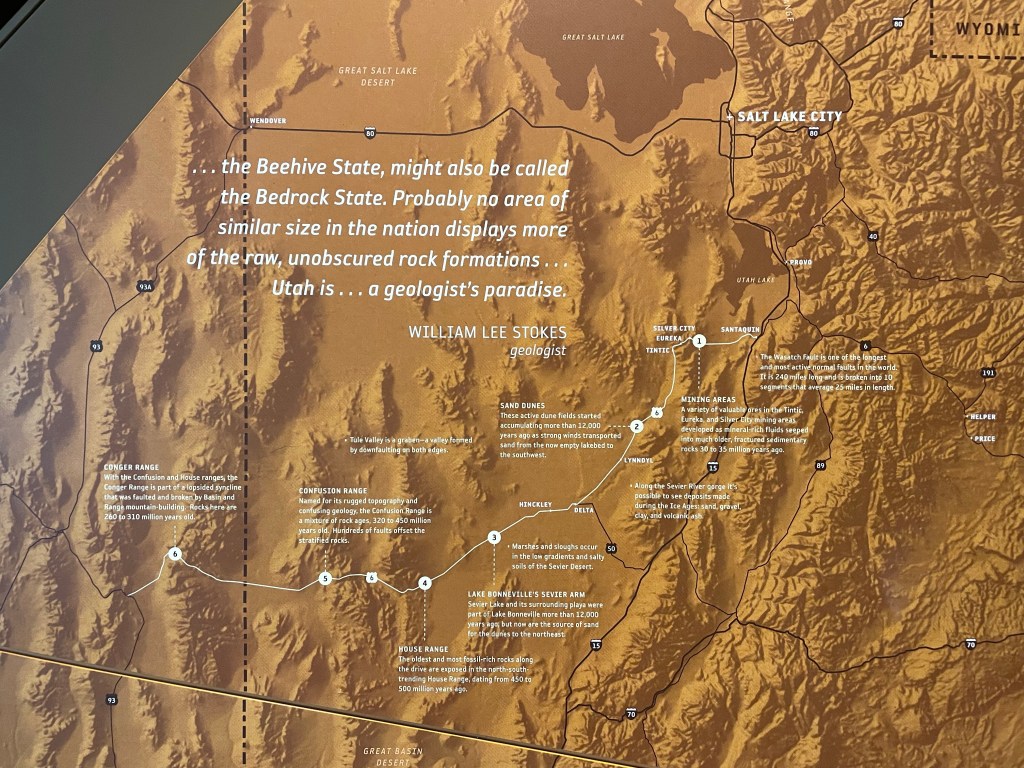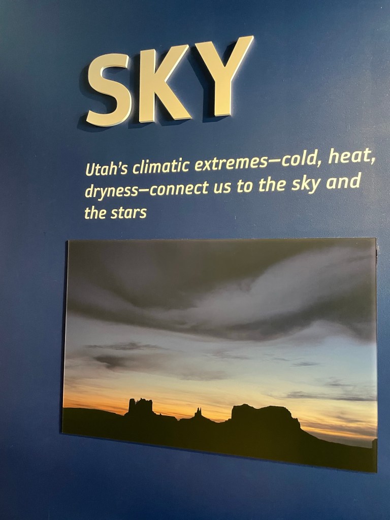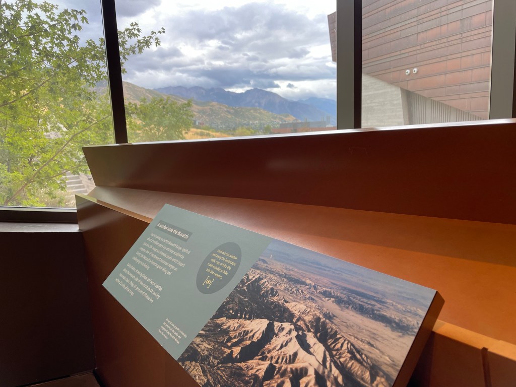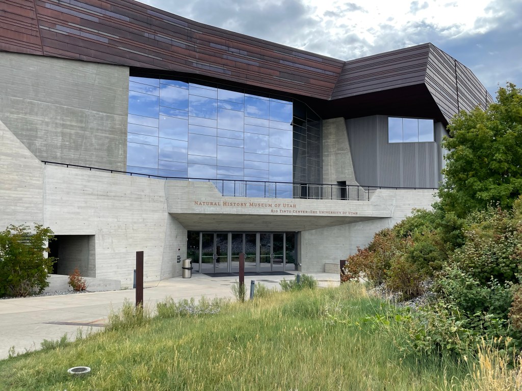 It’s a short drive from our hotel to the Natural History Museum of Utah. The architecture is worth coming to enjoy. The building blends into the mountainside and the inside is laid out in such a way you elevator to the top floor and then walk down through Earth’s natural world, from top to bottom, today to yesteryear.